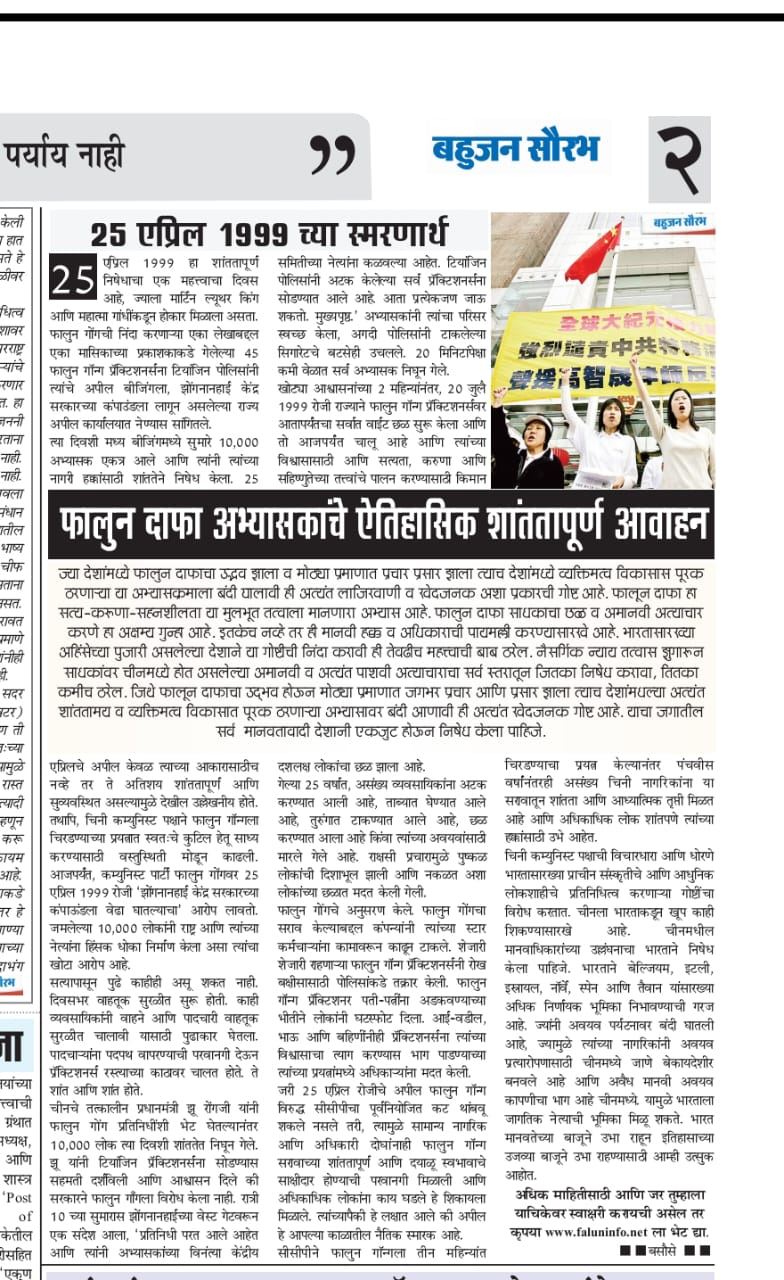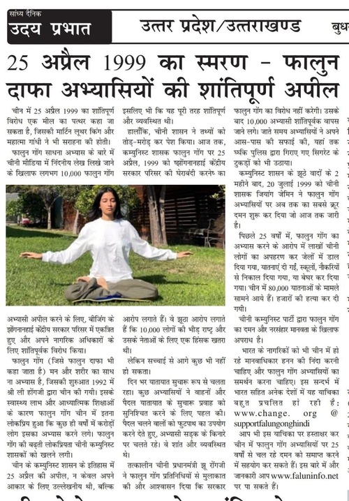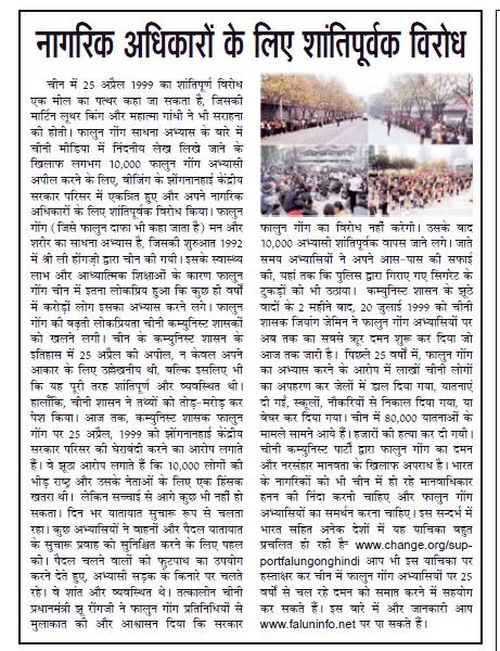 Einige dieser Medien berichteten in der Vergangenheit über die gesundheitlichen Vorteile von Falun Dafa sowie über die Lebensgeschichten indischer Prominenter, die ebenfalls Praktizierende sind. In der Woche vor dem 25. Jahrestag des Appells berichteten die folgenden Medien über das historische Ereignis: