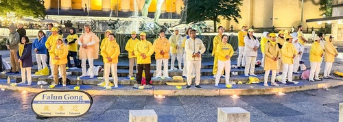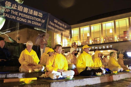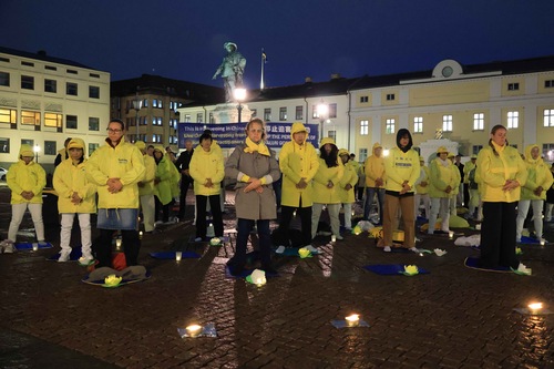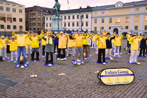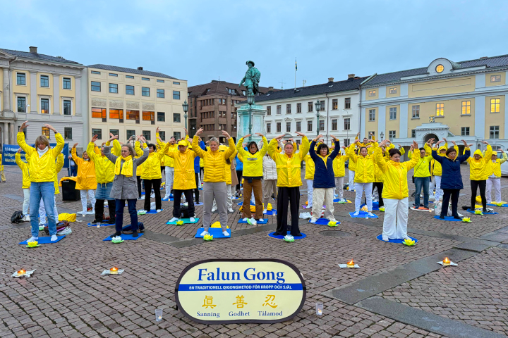 Am 19. September 2025 halten Praktizierende eine Kerzenlichtmahnwache auf dem Gustav Adolfs Torg in Göteborg ab und führen die Falun-Dafa-Übungen vor