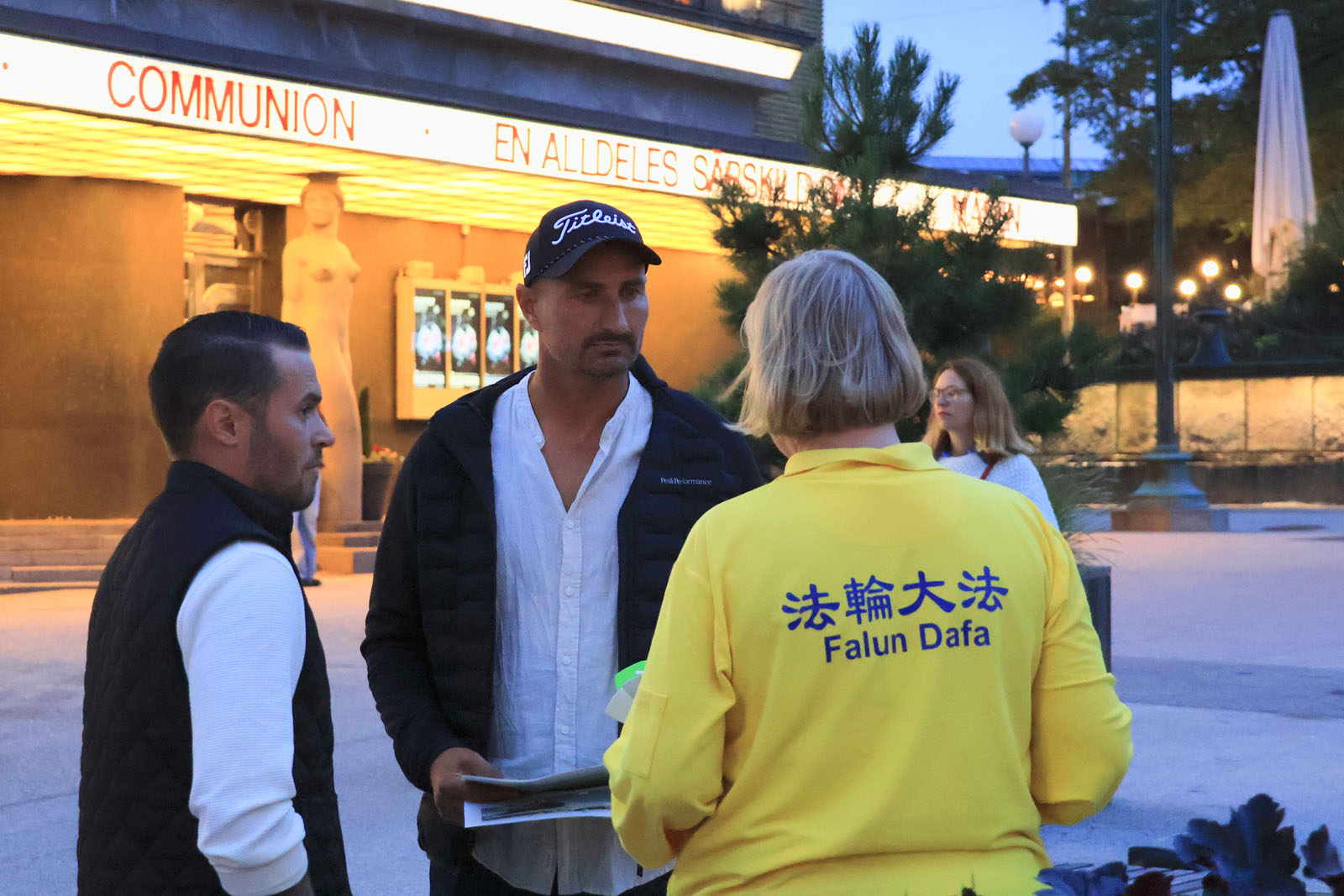 Menschen, die den Konzertsaal an der Westseite des Götaplatsen-Platzes verlassen, wollen mehr über Falun Dafa erfahren