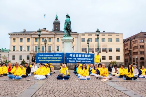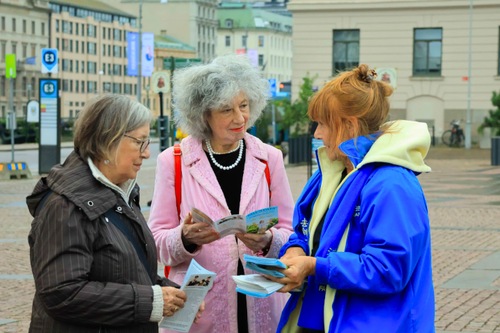 Am Tag darauf, dem 20. September, gingen die Falun-Dafa-Praktizierenden nach einer Kundgebung und Parade zum Götaplatsen, um dort eine weitere Kerzenlichtmahnwache abzuhalten. Viele Menschen, die aus dem Konzertsaal an der Westseite des Platzes traten, erblickten die Praktizierenden, wie sie im Regen ruhig die Übungen ausführten und meditierten. Gerne nahmen sie Informationsmaterialien entgegen oder unterhielten sich lange mit den Praktizierenden, um mehr zu erfahren.