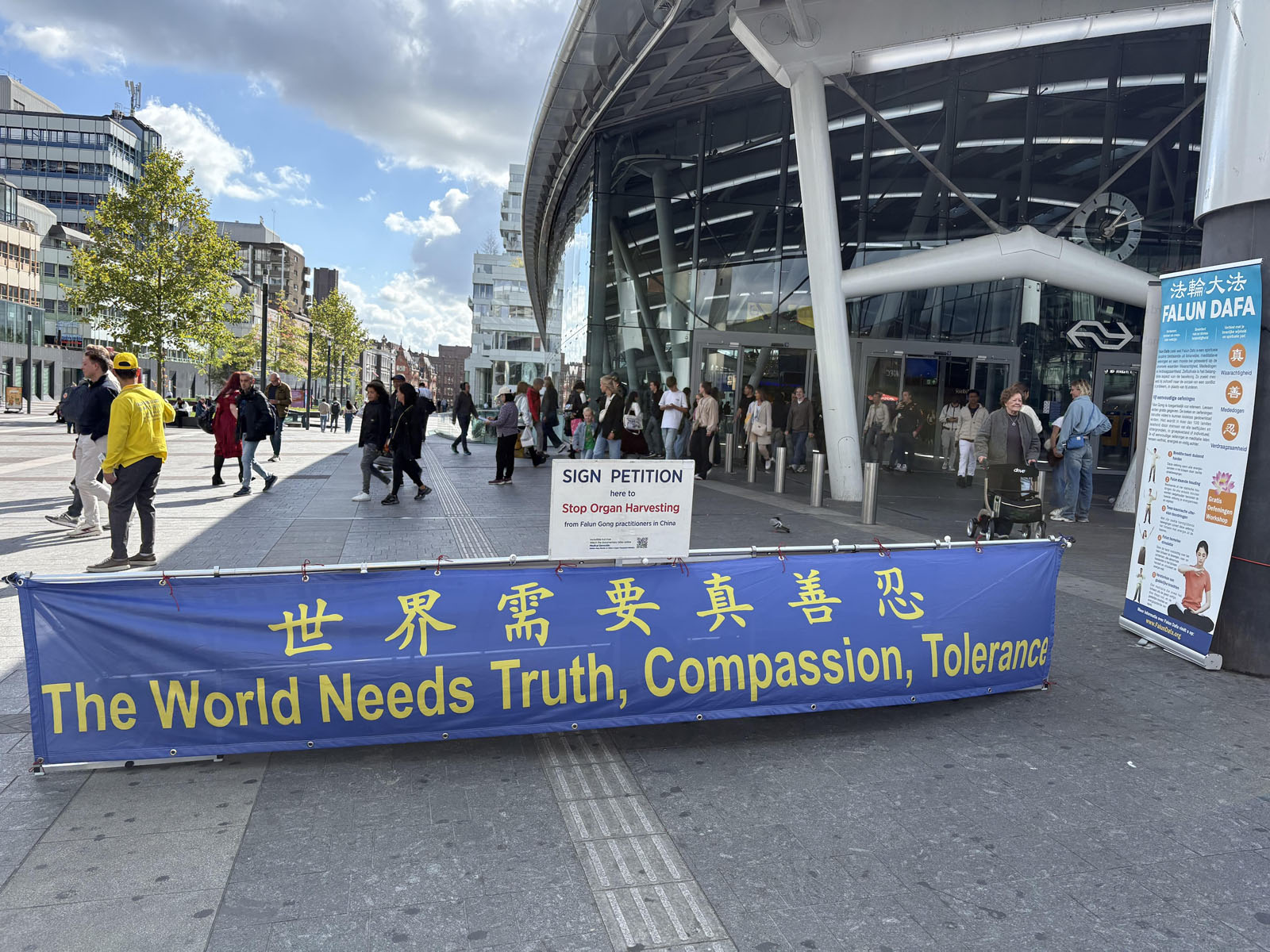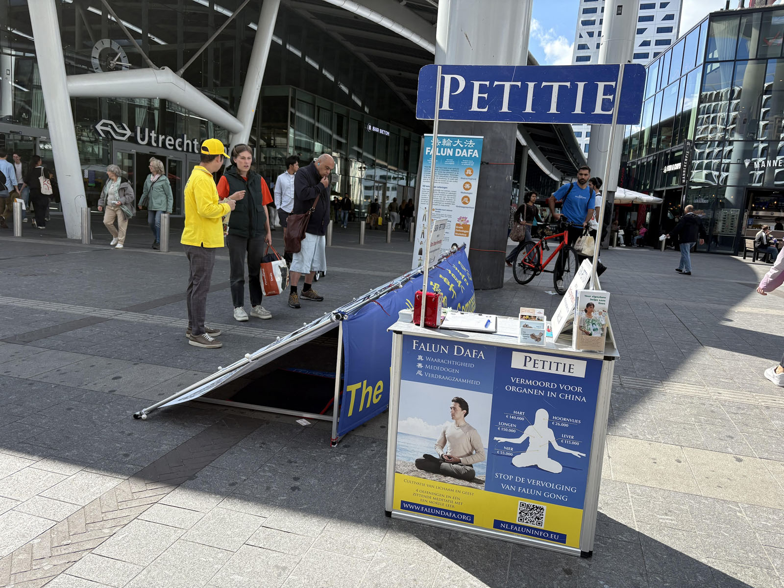 Ein unablässiger Menschenstrom passierte den Stand der Praktizierenden vor dem Utrechter Centraal, dem Hauptbahnhof. Viele blieben stehen, lasen die Transparente, kamen mit den Praktizierenden ins Gespräch und erfuhren so von der Verfolgung.