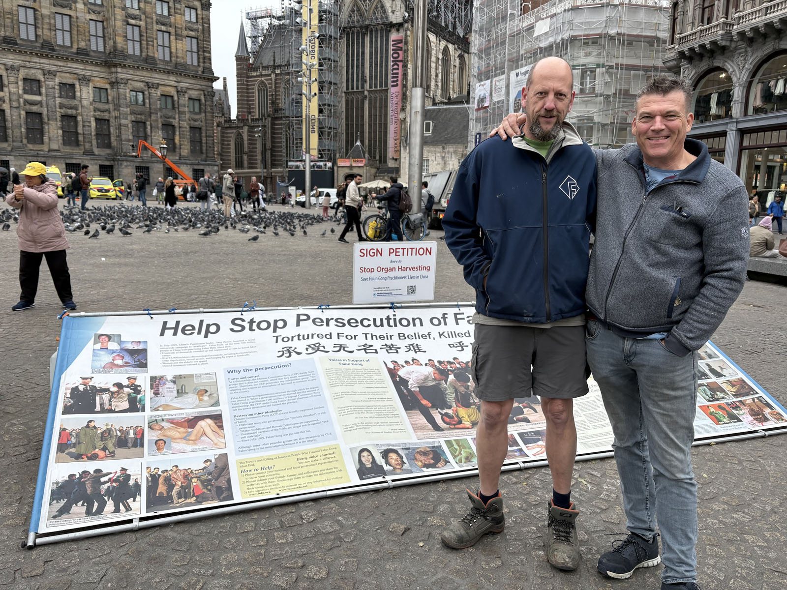 Auch die beiden Niederländer Erwin Boven, ein Qualitätskontrolleur, und John van Ballegooijen, ein Unternehmer für Haushaltsauflösungen, kamen mit den Praktizierenden ins Gespräch und erfuhren dadurch mehr über die Verfolgung von Falun Dafa in China.