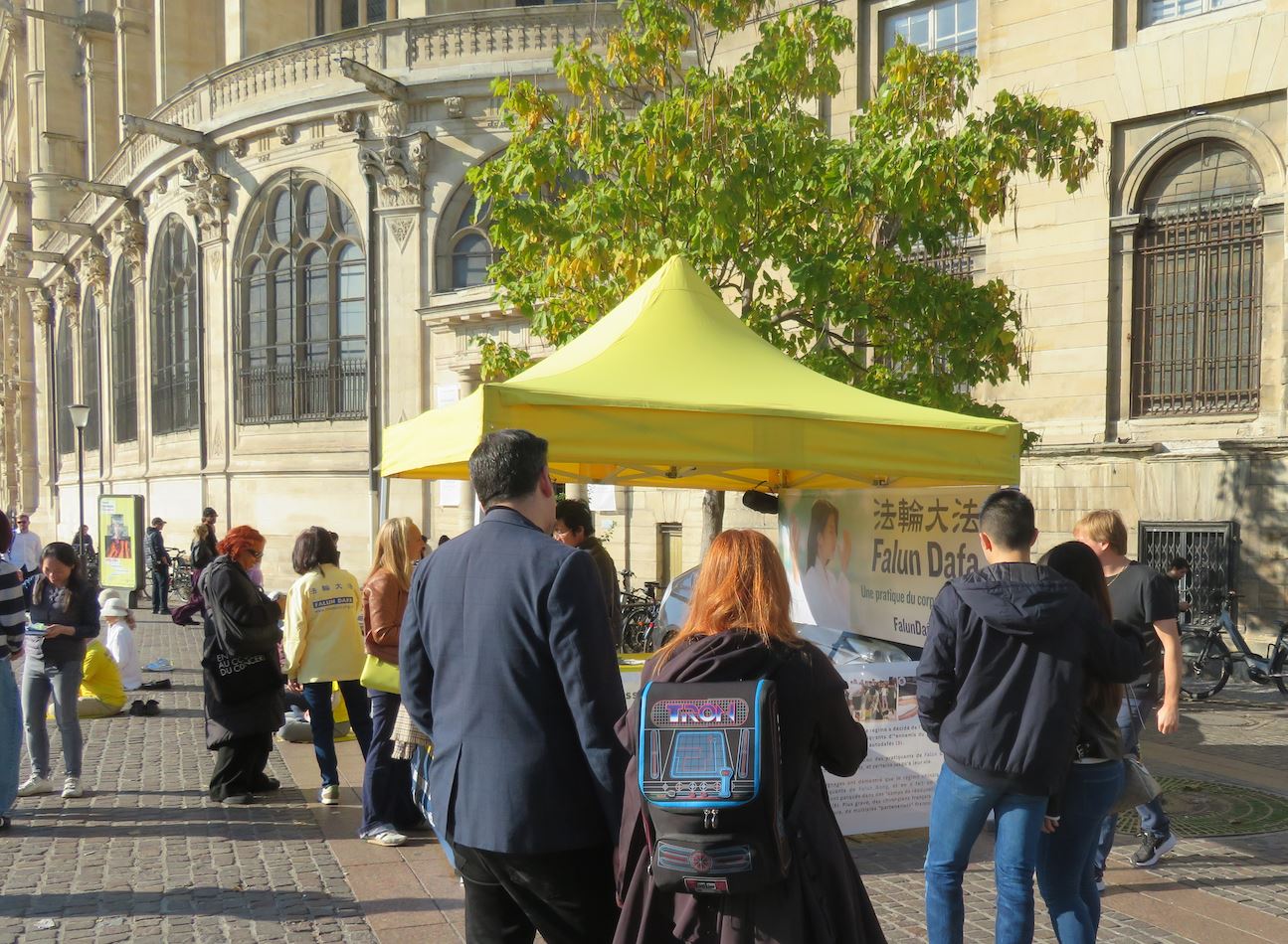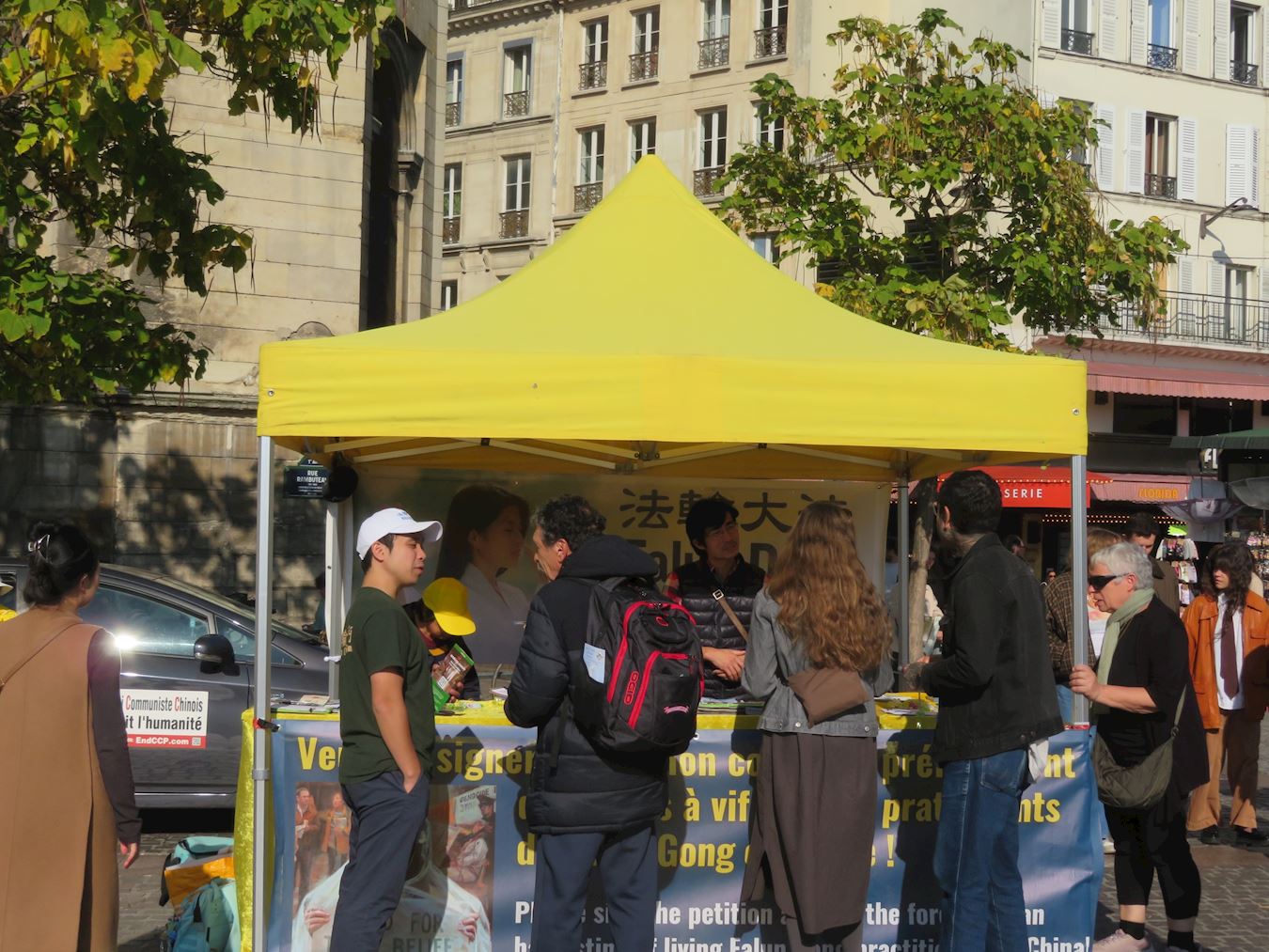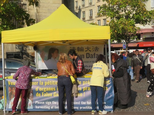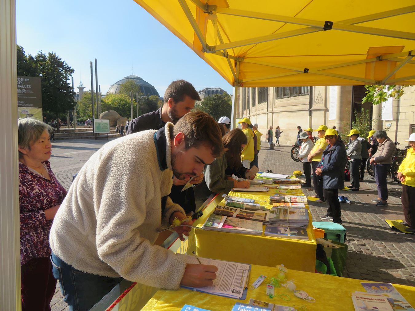 Während der Veranstaltung in Châtelet am 11. Oktober führten die Praktizierenden die Falun-Dafa-Übungen vor. Viele Passanten blieben stehen, um zuzuschauen. Einige äußerten den Wunsch, die Übungen selbst zu erlernen, und notierten sich den Übungsplatz in Paris. Die auffälligen Transparente und Plakate der Praktizierenden zogen zahlreiche Blicke auf sich und regten zum Nachdenken an. Nachdem die Passanten über Falun Dafa und die von der KPCh geförderte Zwangsentnahme von Organen an Gewissensgefangenen –von denen die meisten Falun-Dafa-Praktizierende sind – informiert worden waren, zeigten sich viele empört und unterzeichneten eine Petition, in der sie ein Ende der Verfolgung forderten.
