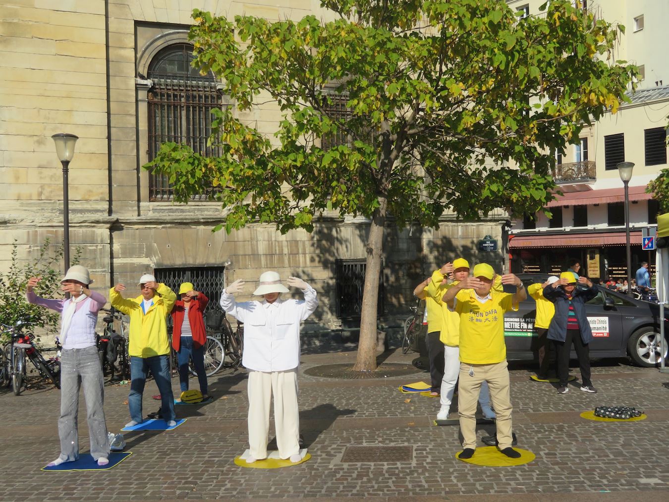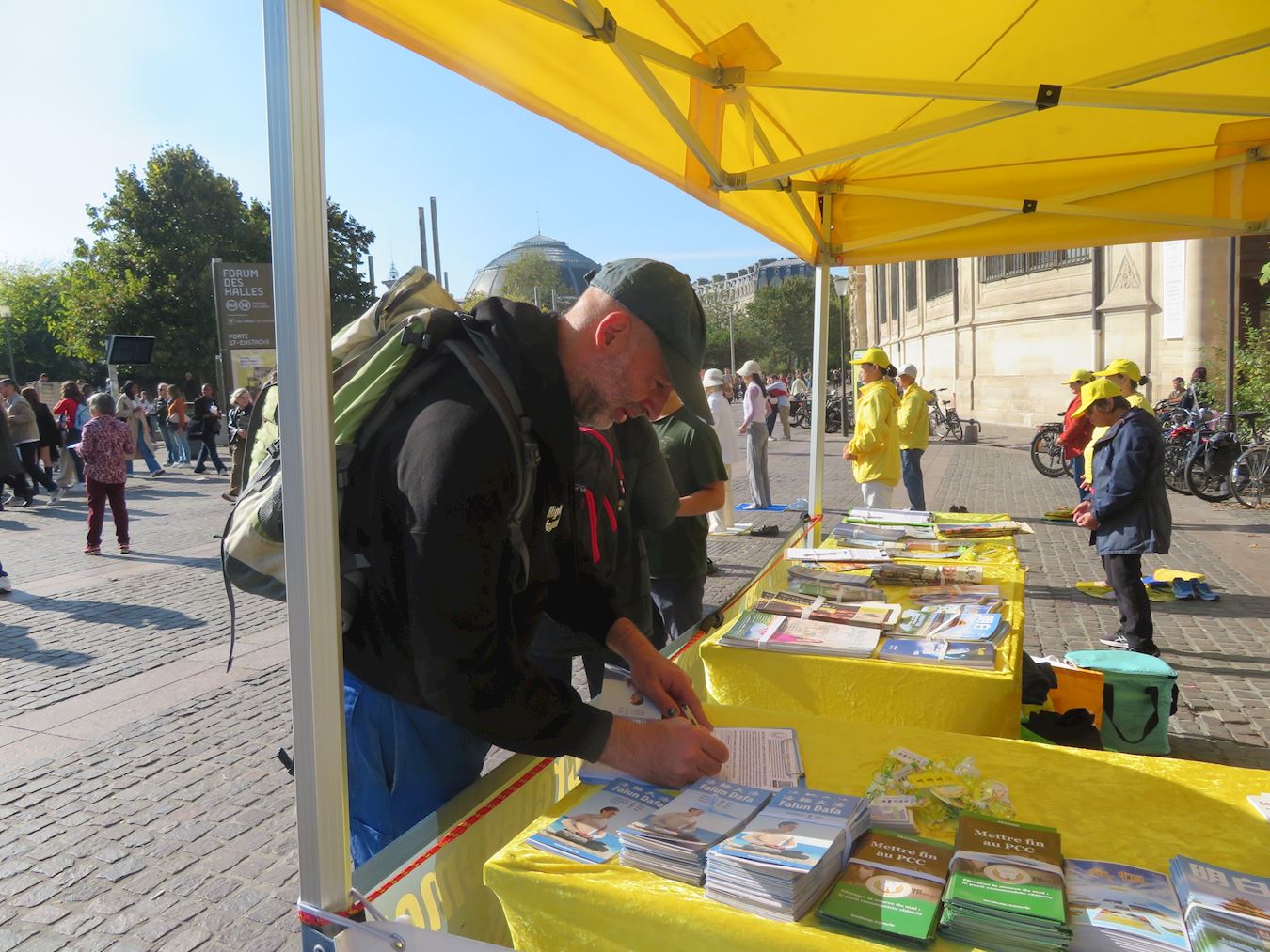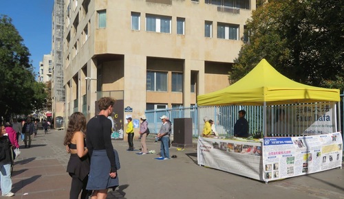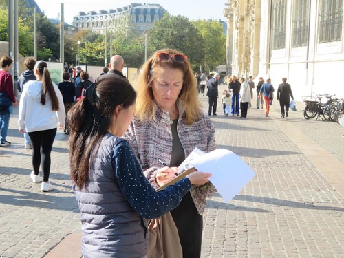 Während der Veranstaltung in Châtelet am 11. Oktober führten die Praktizierenden die Falun-Dafa-Übungen vor. Viele Passanten blieben stehen, um zuzuschauen. Einige äußerten den Wunsch, die Übungen selbst zu erlernen, und notierten sich den Übungsplatz in Paris. Die auffälligen Transparente und Plakate der Praktizierenden zogen zahlreiche Blicke auf sich und regten zum Nachdenken an. Nachdem die Passanten über Falun Dafa und die von der KPCh geförderte Zwangsentnahme von Organen an Gewissensgefangenen –von denen die meisten Falun-Dafa-Praktizierende sind – informiert worden waren, zeigten sich viele empört und unterzeichneten eine Petition, in der sie ein Ende der Verfolgung forderten.