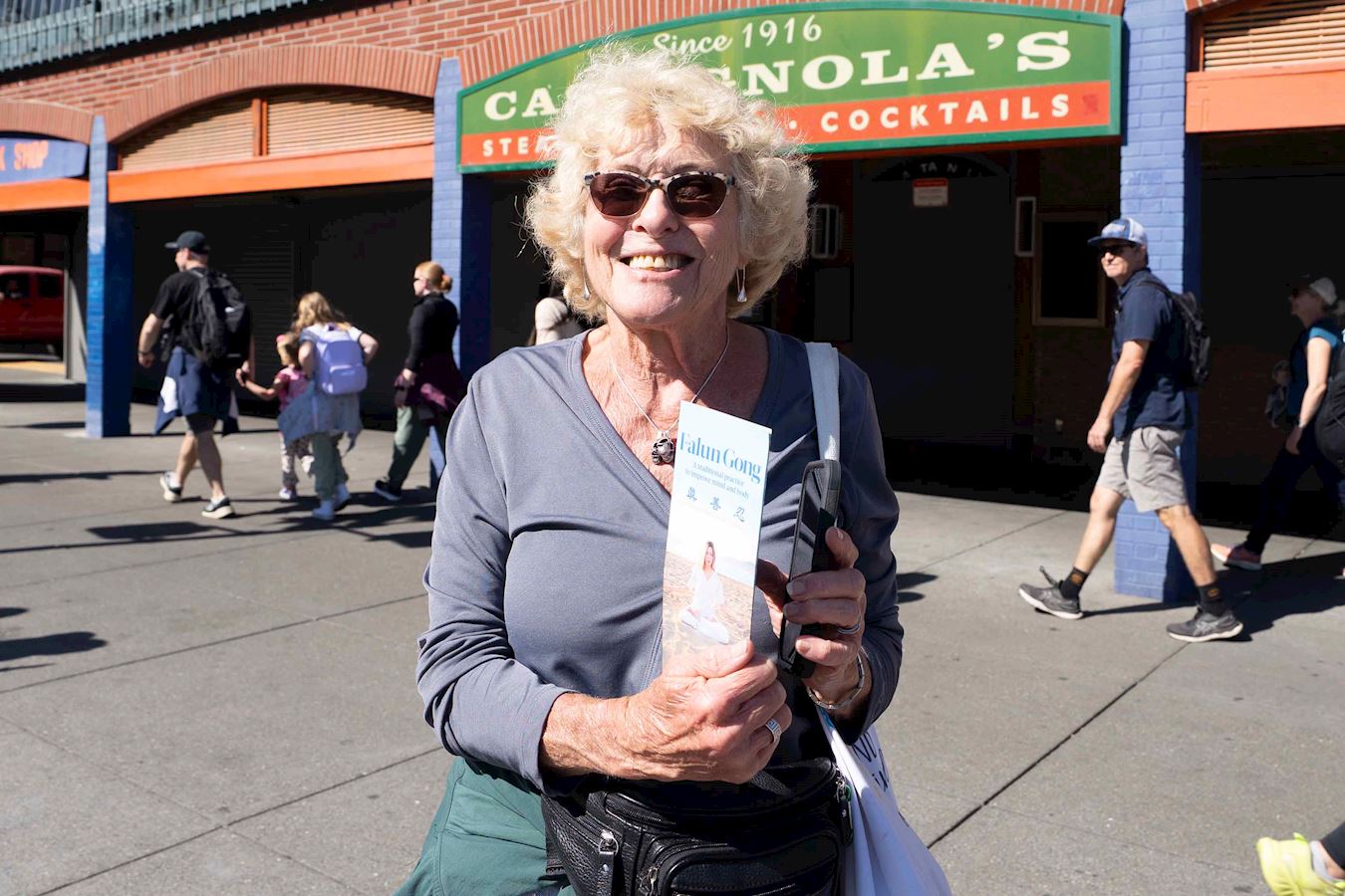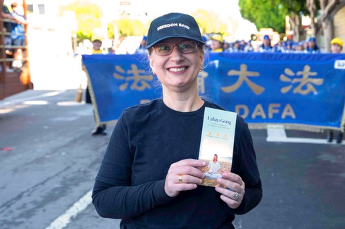 Dann bemerkte sie einen Flyer mit Informationen über Falun Dafa und rief: „Das ist eine Meditationspraxis! Wahrhaftigkeit, Güte und Nachsicht – das ist hervorragend! Ich komme aus Sacramento und möchte Ihrer Band am liebsten beitreten. Gibt es in Sacramento Falun-Dafa-Praktizierende?“