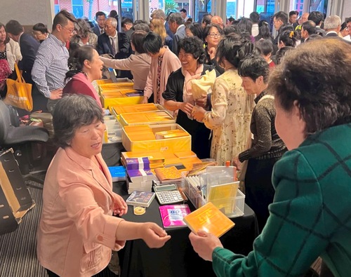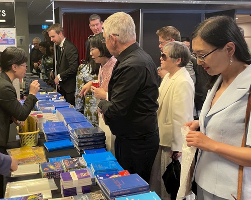 Praktizierende kaufen während der Konferenzpause Falun-Dafa-Bücher am Stand der Tianti-Buchhandlung
