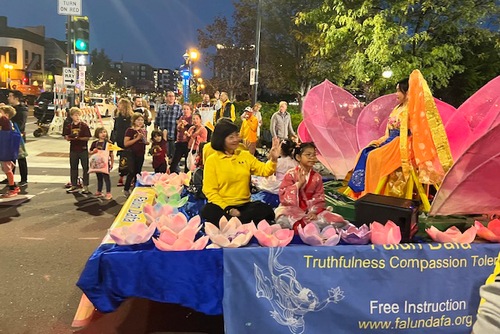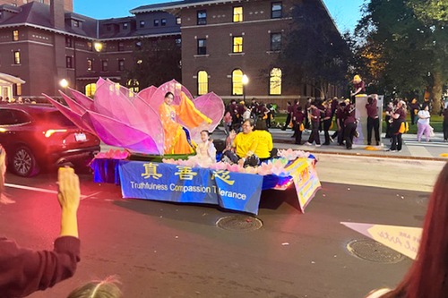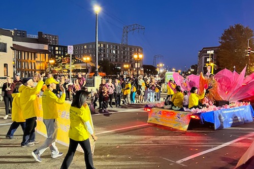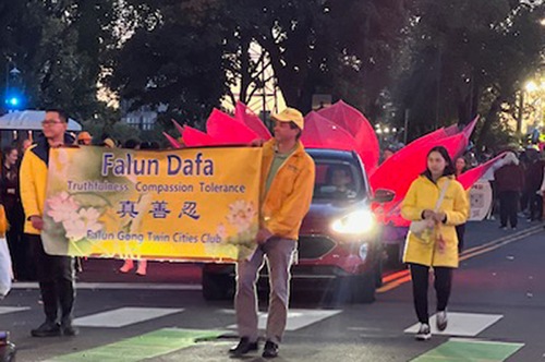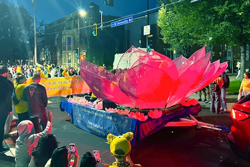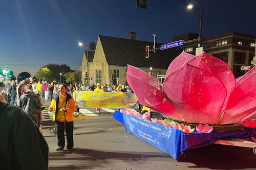 Die Parade begann um 18.30 Uhr. Der Festwagen der Mitglieder des Falun Gong Twin Cities Clubs war mit einer großen rosa Lotusblume geschmückt und Praktizierende in traditionellen chinesischen Kostümen winkten den Zuschauern zu. Andere Praktizierende trugen Transparente vor und hinter dem Festwagen und verteilten Lotusblumen entlang der Paradestrecke.