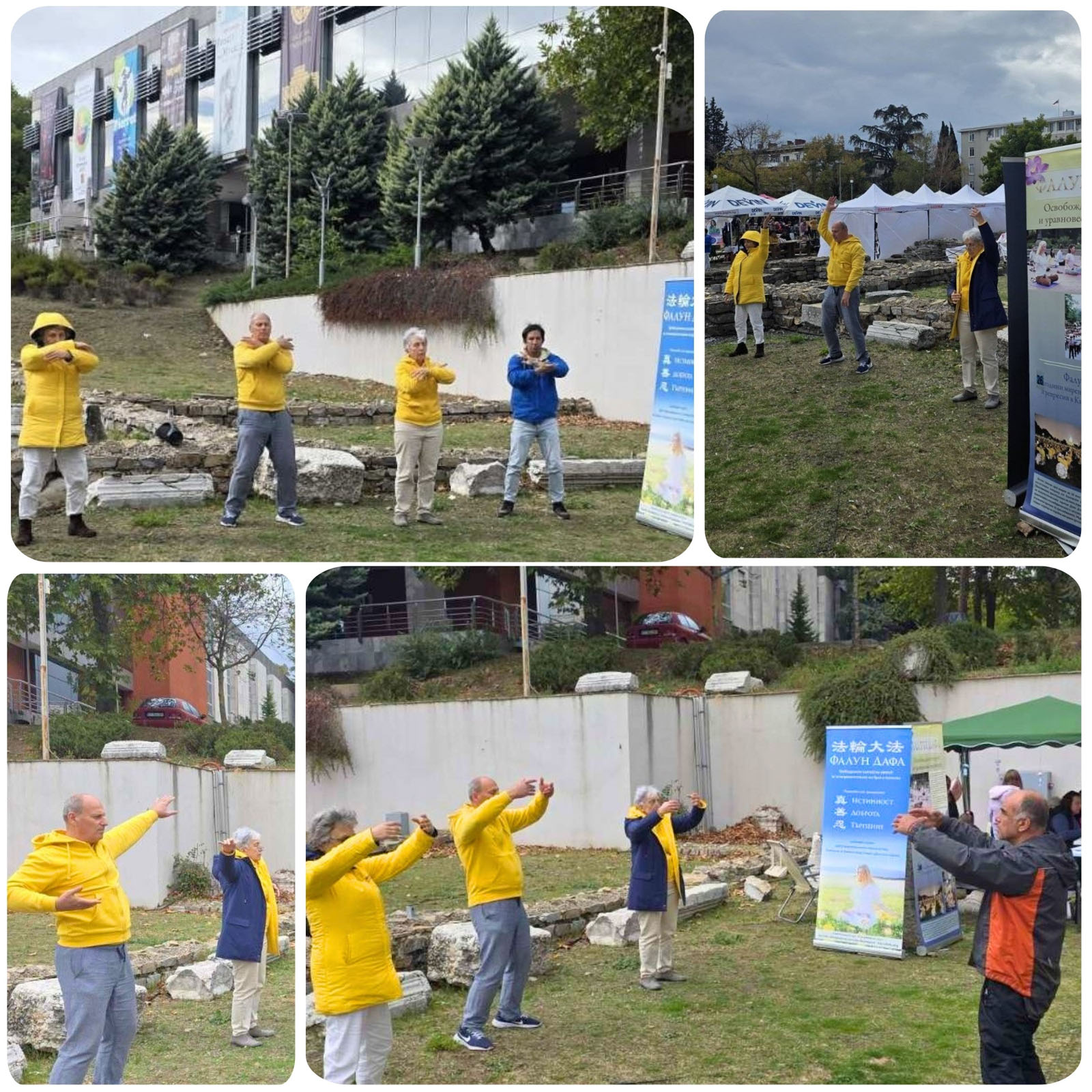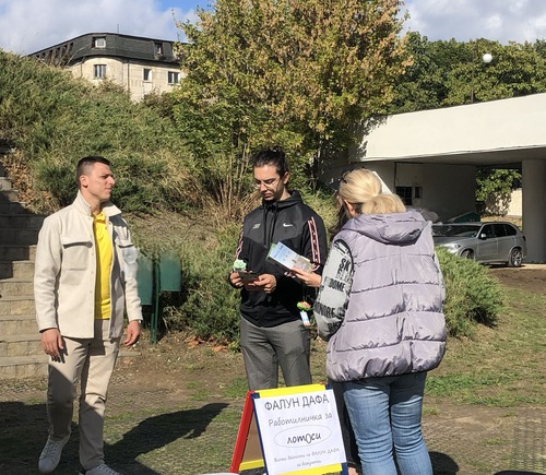Der Informationsstand und die Transparente befanden sich in einem stark frequentierten Bereich, der an beiden Tagen von einem stetigen Besucherstrom geprägt war. Auf einem kleinen Tisch am Stand wurden die bulgarischen Ausgaben der Falun-Dafa-Bücher – Zhuan Falun und Falun Gong – sowie weitere Informationsmaterialien ausgestellt.