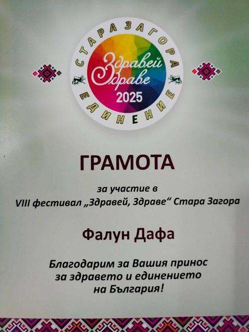 (Minghui.org) Am 11. und 12. Oktober 2025 fand in der Stadt Stara Zagora, bekannt als „Stadt der Lindenbäume und der Dichter“, das 8. Festival „Hello, Health!“ statt. Praktizierende von Falun Dafa aus verschiedenen Teilen Bulgariens nahmen an der Veranstaltung teil, um ihre spirituelle Praxis der Öffentlichkeit vorzustellen. Die Veranstalter des Festivals überreichten den Praktizierenden eine Teilnahmeurkunde als Zeichen der Anerkennung für ihren Beitrag zur Gesundheit und zum Gemeinsinn Bulgariens.