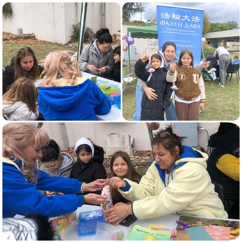 Die Praktizierenden verteilten Flyer über die Praktik und die Verfolgung, sprachen mit den Menschen, bastelten Lotusblumen und führten die Übungen vor. Der Lotusblumen-Bastelkurs machte den Kindern Spaß und gab ihnen zugleich die Möglichkeit, etwas über Wahrhaftigkeit, Güte und Nachsicht zu erfahren. Während sie die Blumen aus Papier falteten, erklärten die Praktizierenden ihnen anhand eines von Praktizierenden verfassten Kinderbuchs mit dem Titel „Eine Lotus-Geschichte“ die Vorteile eines Lebens nach diesen Werten.