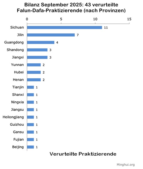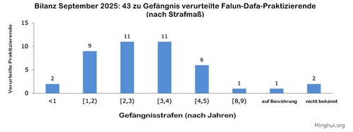 (Minghui.org) Im September 2025 wurden insgesamt 43 Falun-Dafa-Praktizierende wegen ihres Glaubens verurteilt.