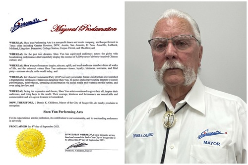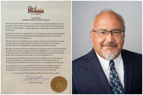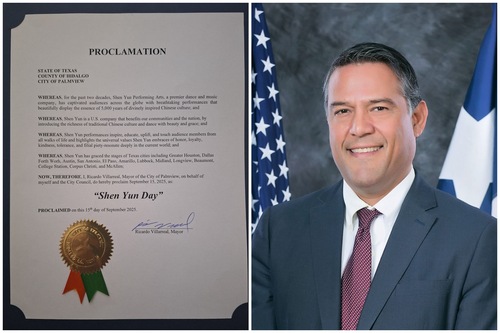 Ricardo Villarreal, Bürgermeister im texanischen Palmview erklärte den 15. September 2025 zum „Shen-Yun-Tag“ in der Stadt. Am selben Tag erließ David Moreno, Bürgermeister von Donna, Texas, eine Proklamation für Shen Yun und würdigte damit die bemerkenswerte Widerstandsfähigkeit der Künstler angesichts widriger Umstände und ihren großen Beitrag zur Gesellschaft durch die außergewöhnliche und ausgefeilte Kunstfertigkeit.
