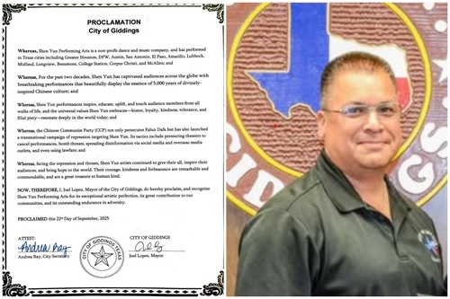 Bürgermeister Joel Lopez von Giddings erließ am 22. September 2025 eine Proklamation für Shen Yun Performing Arts. Er lobte Shen Yun dafür, dass es mit seinen exquisiten Darbietungen die Essenz göttlich inspirierter Kultur zeige und so der Gemeinde und dem Land zugutekomme. Außerdem pries er die Shen-Yun-Künstler für ihren Mut und ihre Freundlichkeit angesichts der transnationalen Repression der Kommunistischen Partei Chinas (KPCh).