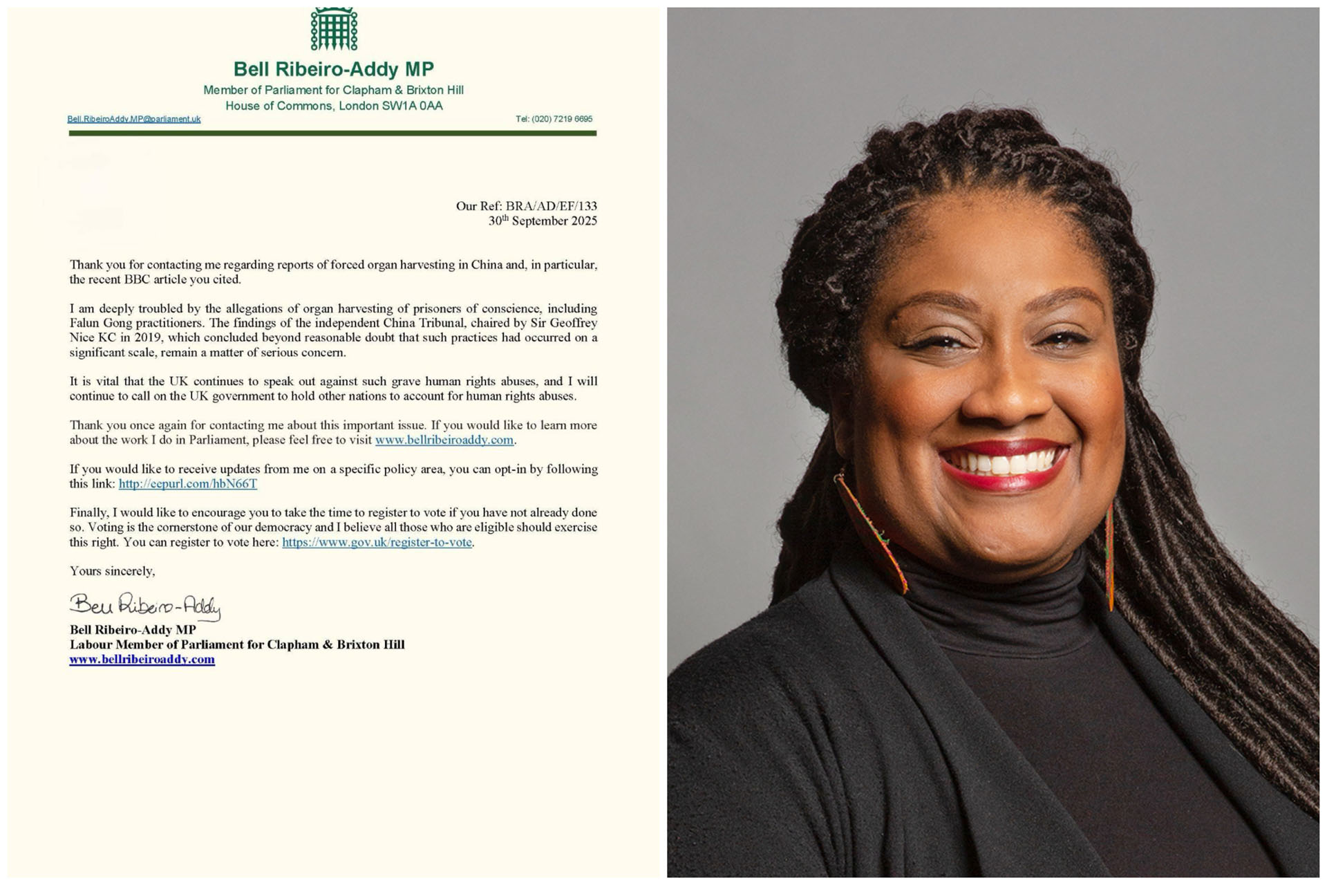 Die Abgeordnete Bell Ribeiro-Addy schrieb: „Ich bin zutiefst besorgt über die Anschuldigungen des Organraubs an Gewissensgefangenen, darunter auch an Falun-Gong-Praktizierenden. Die Ergebnisse des unabhängigen China-Tribunals unter dem Vorsitz von Sir Geoffrey Nice KC im Jahr 2019, das mit ,über jeden vernünftigen Zweifel hinaus‘ zu dem Schluss kam, dass solche Praktiken in erheblichem Umfang stattgefunden haben, geben weiterhin großen Anlass zur Sorge.“