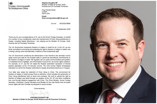 Der Abgeordnete Stephen Doughty erklärte in seinem Brief: „Die britische Regierung engagiert sich für die Religions- und Glaubensfreiheit aller Menschen. In Großbritannien treten wir entschlossen für die Förderung und den Schutz dieses Rechts ein und setzen uns auch international mit Nachdruck für seine Wahrung ein.