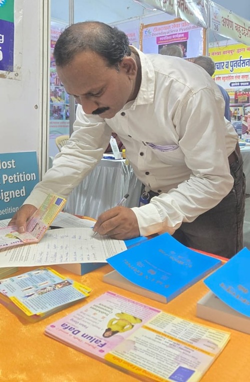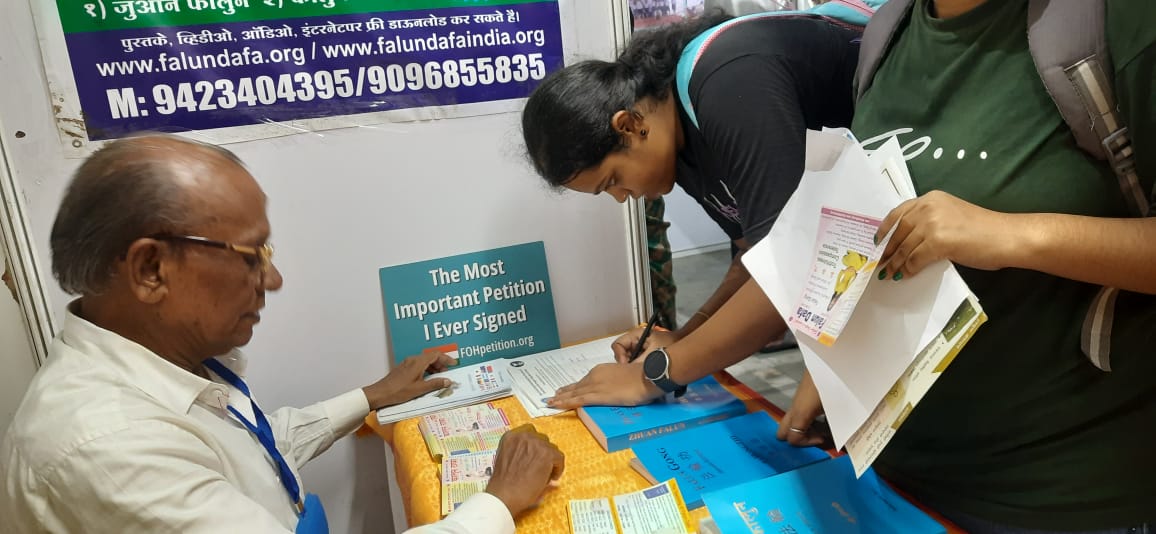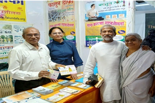 Die renommierten Sozialarbeiter Padmashri Dr. Ravindra Kolhe und Smita Kolhe, die für ihren jahrzehntelangen Einsatz in abgelegenen Stammesgebieten bekannt sind, besuchten den Falun-Dafa-Stand auf der Ausstellung. Ihre Anwesenheit ermutigte die Praktizierenden und verlieh der Veranstaltung zusätzliche Aufmerksamkeit, wodurch mehr Besucher dazu inspiriert wurden, sich über die Praxis zu informieren.