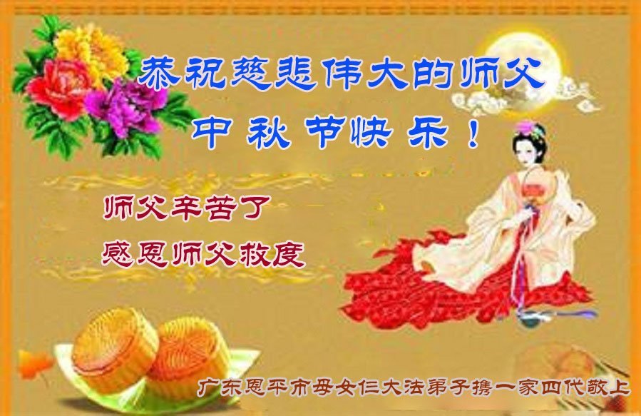(Minghui.org) Das Mittherbstfest (auch bekannt als Mondfest), ein traditioneller chinesischer Feiertag für Familientreffen und Erntedank, fällt dieses Jahr auf den 6. Oktober. Falun-Dafa-Praktizierende aus ganz China haben an Minghui geschrieben und sich bei Meister Li, dem Begründer von Falun Dafa, für die Einführung der Praxis und die Begleitung auf ihrem Kultivierungsweg bedankt. Die folgenden Grüße wurden von Praktizierenden aus 30 Provinzen, Kommunen und autonomen Regionen Chinas eingereicht.