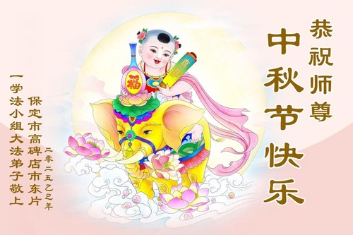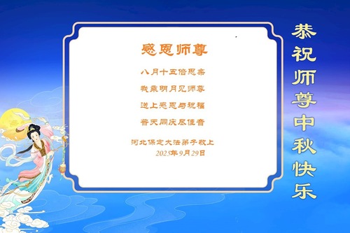 (Minghui.org) Zum Mittherbstfest senden Falun-Dafa-Praktizierende aus aller Welt Glückwünsche und Grußkarten an die Minghui-Website. Damit wünschen sie dem verehrten Meister Li Hongzhi respektvoll ein frohes Fest und danken für die Lehre des Falun Dafa mit den universellen Werten Wahrhaftigkeit, Güte und Nachsicht.
