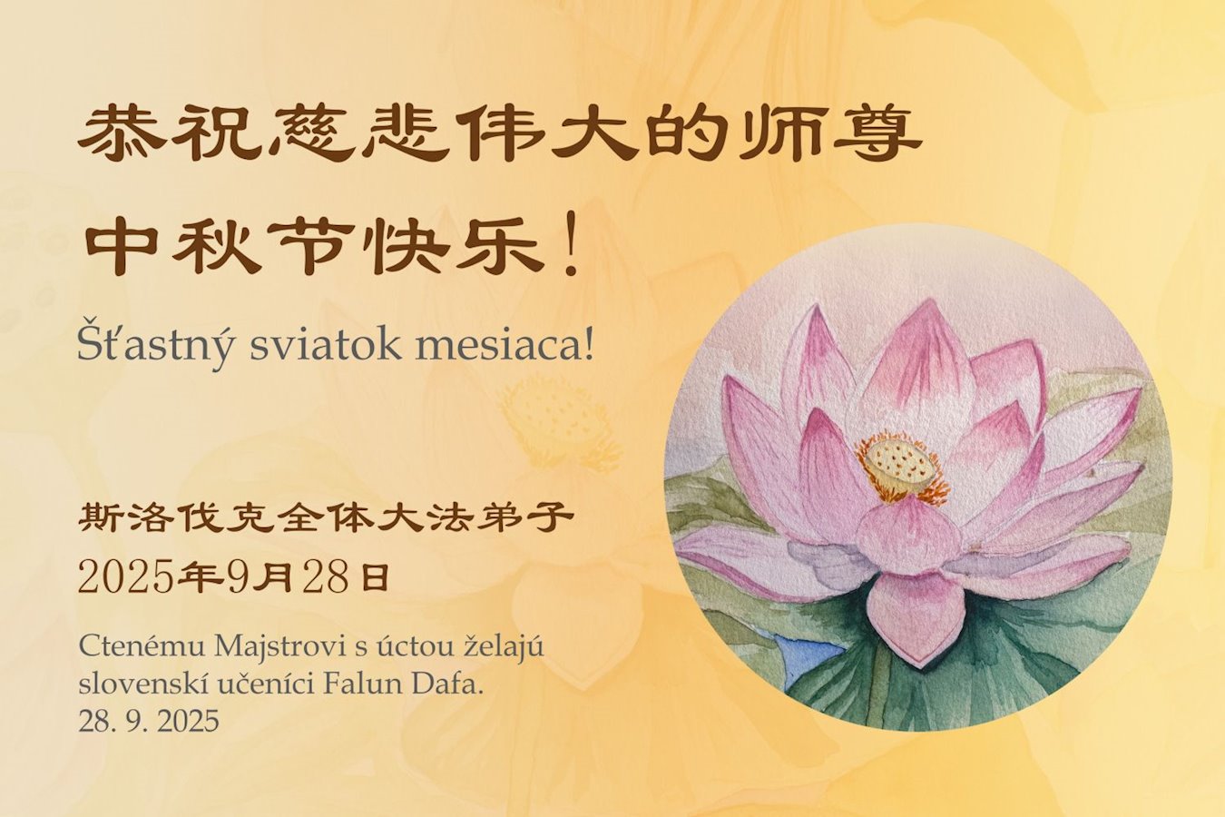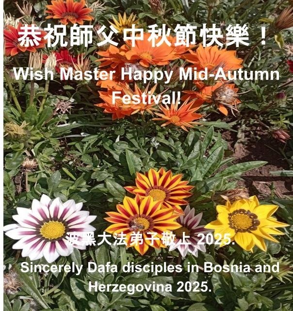 Falun-Dafa-Praktizierende aus der Slowakei wünschen Meister Li ein frohes MittherbstfestSie schrieben: „Meister, wir sind dankbar für Ihre grenzenlose Barmherzigkeit und Ihre Erlösung. Wir werden Ihre Barmherzigkeit niemals zurückzahlen können. Wir werden weiterhin fleißig praktizieren und ihnen alles anvertrauen. Wir werden die drei Dinge tun, unsere Gelübde erfüllen und Ihnen auf dem Weg nach Hause folgen.“