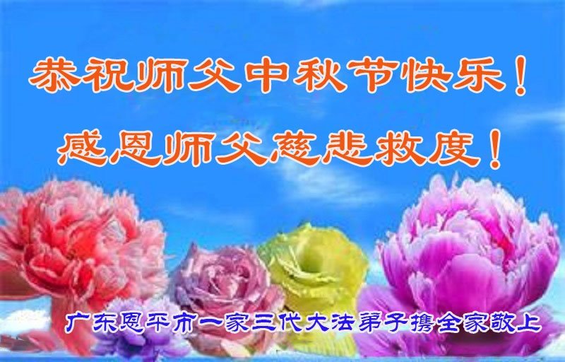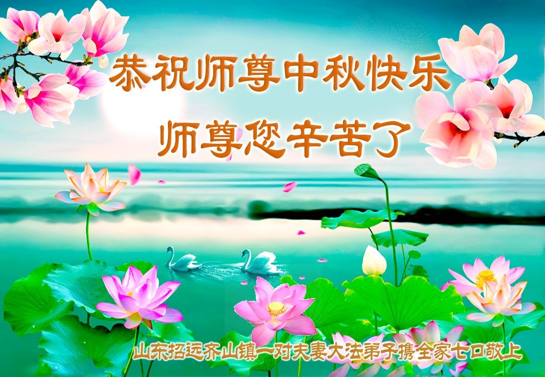 Ein Ehepaar in der Stadt Qishan, Stadt Zhaoyuan, Provinz Shandong, samt seiner 7-köpfigen Familie wünscht dem verehrten Meister ein frohes Mittherbstfest! Sie schreiben: „Unsere ganze Familie glaubt an Dafa und den Meister; alle haben viel von Dafa profitiert. Mein Enkelkind schreibt seine Doktorarbeit und meine Enkelin studiert im Ausland. Sobald mein Enkel heimkommt, macht er Kotau vor dem Foto des Meisters, zündet Räucherstäbchen an und erinnert mich daran, den Meister zu respektieren und seinen Ruf zu bewahren!“