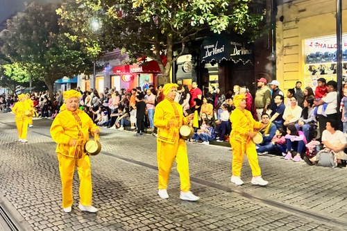 Angeführt wurde die Gruppe vom Hüfttrommelteam, das von den Zuschauern herzlich empfangen wurde. Beim Marsch im Rhythmus von „Falun Dafa ist gut“ jubelten und applaudierten die Zuschauer. Viele Menschen äußerten auch ihre Bewunderung für die Übungsvorführung der Praktizierenden.