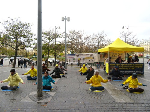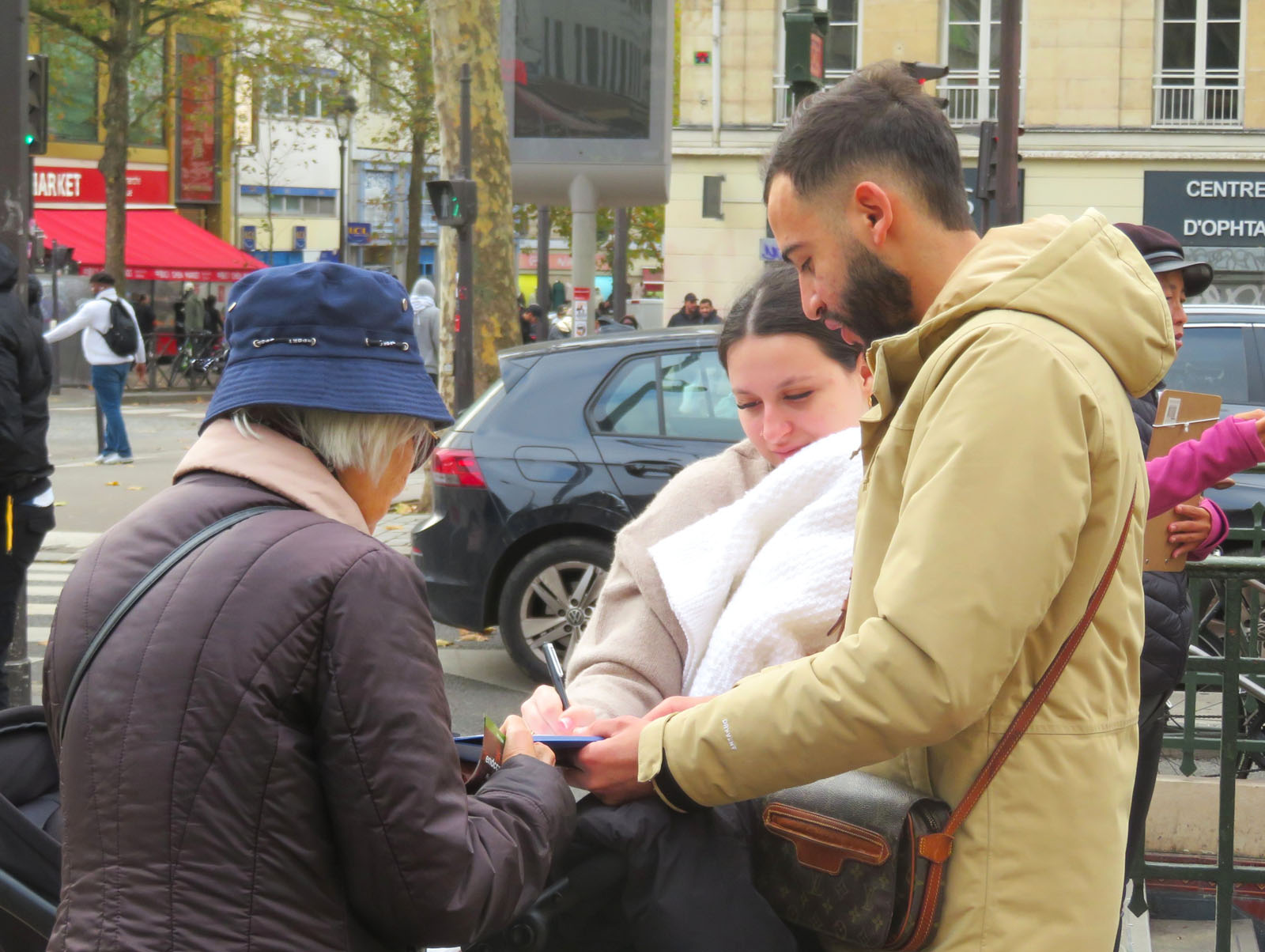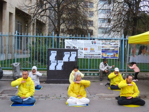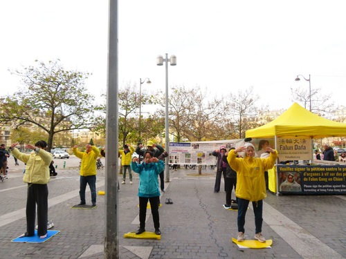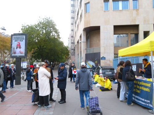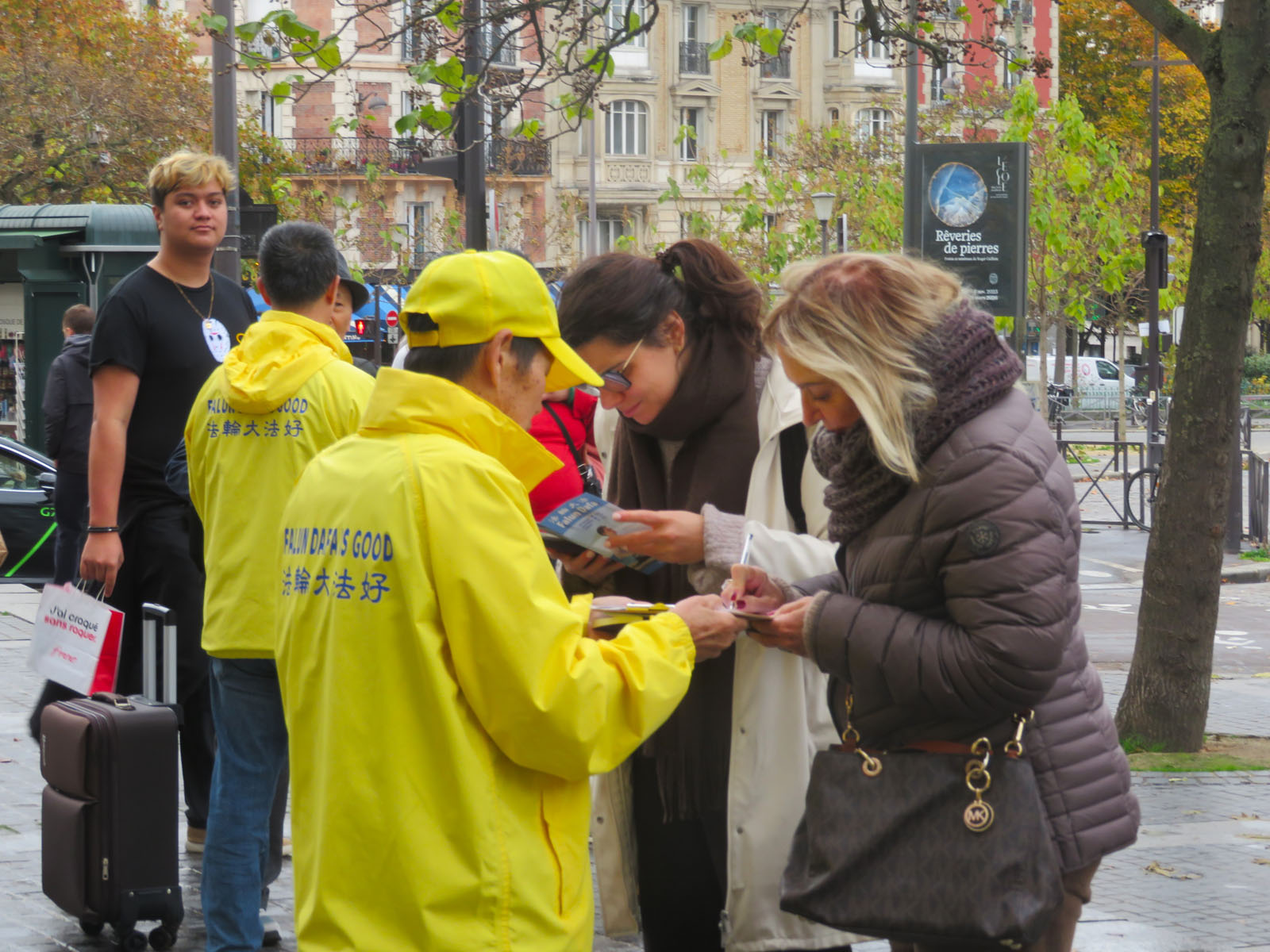 Der 11. November ist in Frankreich ein Feiertag. Falun-Dafa-Praktizierende trafen sich in Belleville, führten die Übungen vor und sprachen mit Passanten über den spirituellen Kultivierungsweg und die Verfolgung durch die KPCh. Viele unterzeichneten eine Petition gegen die Verfolgung. Mehrere Chinesen traten im Rahmen der Veranstaltung aus der KPCh und den ihr angeschlossenen Jugendorganisationen aus.