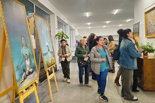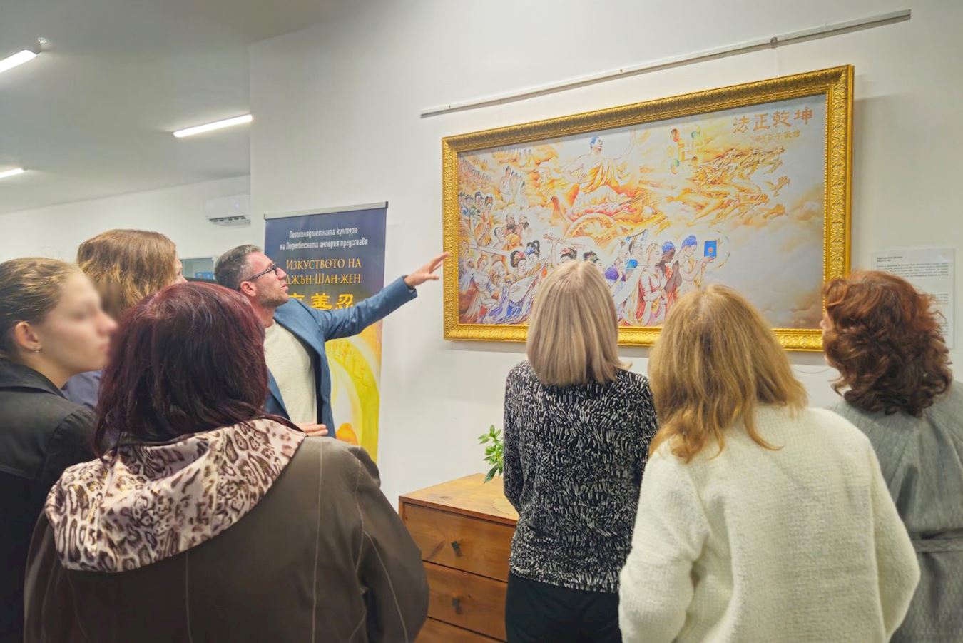 Falun-Dafa-Praktizierende aus Stara Zagora begrüßten die Einwohner von Svilengrad, die zur Eröffnung der Ausstellung gekommen waren, und erklärten ihnen die Hintergründe der einzelnen Gemälde – warum die Ausstellung ins Leben gerufen wurde und welche Botschaften die Werke vermitteln.