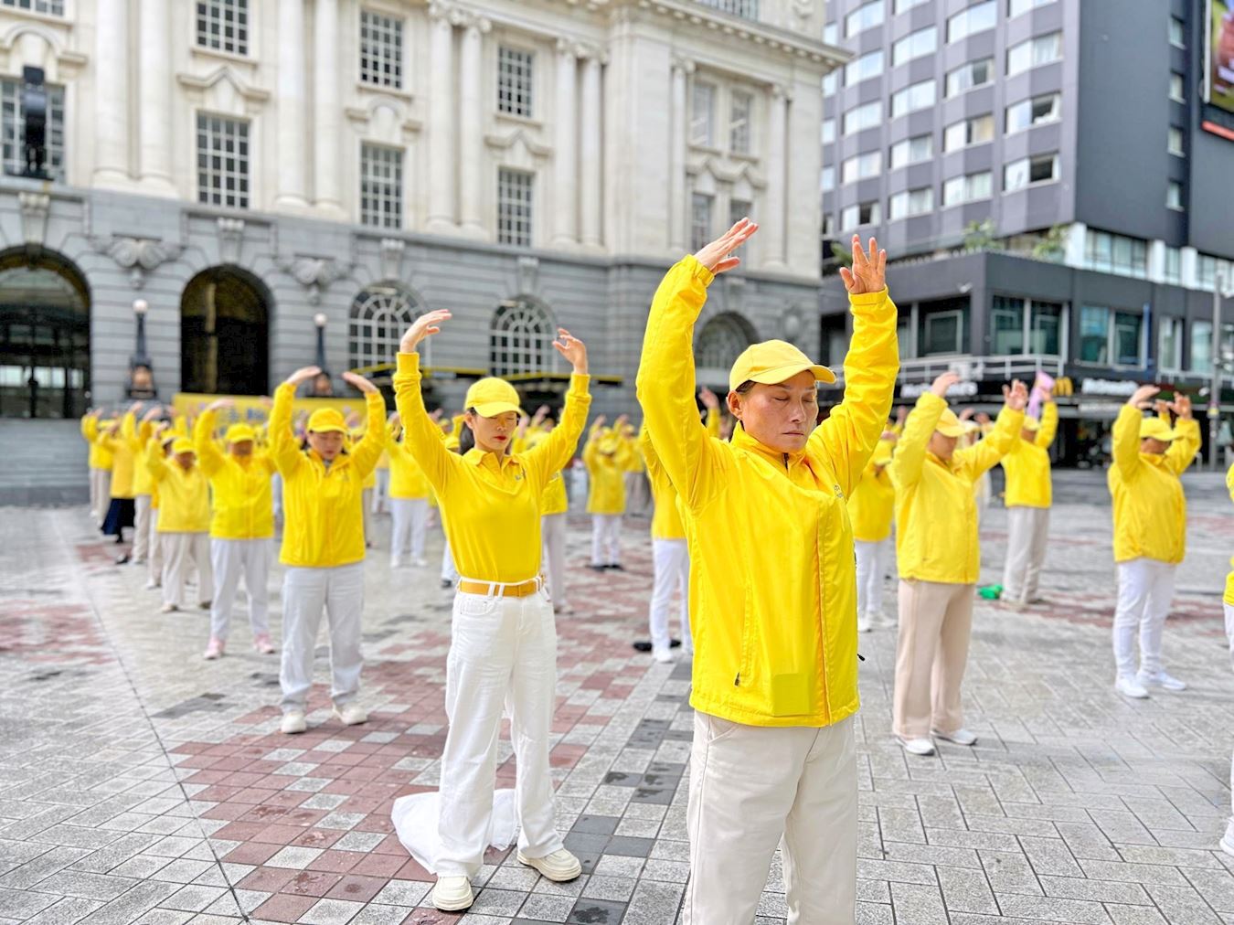 Falun-Dafa-Praktizierende führen am 15. November 2025 auf dem Commercial Bay Square die Übungen vor