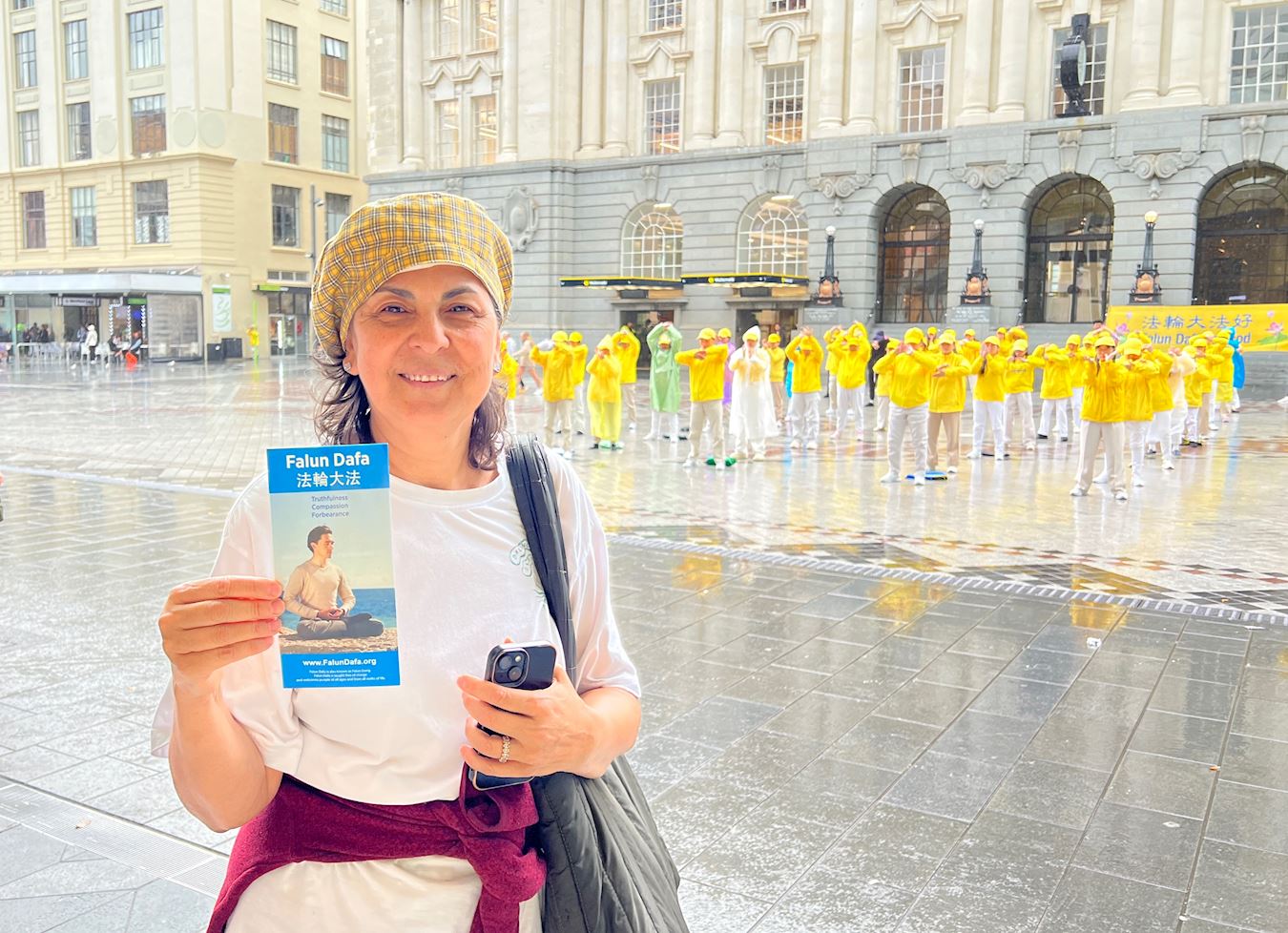 Sie sagte, sie habe in der Türkei Qigong gelernt und unterrichte Yoga und Meditation. Als sie den Praktizierenden bei den Übungen zusah, erklärte sie, es sei friedlich und könne modernen Menschen helfen, in ihrem geschäftigen Leben ruhig und ausgeglichen zu bleiben. Kultivierung könne Menschen helfen, „ihr eigenes Leben und die Verbindung zu ihrem wahren Selbst klarer zu sehen“.