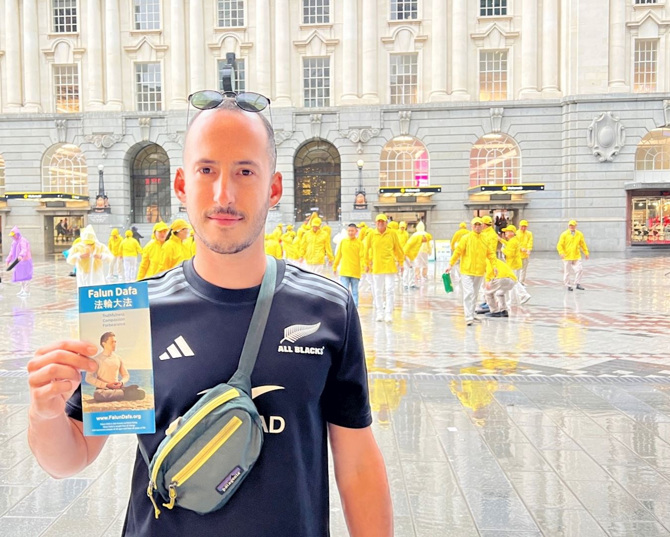 Alex aus Frankreich blieb stehen und unterhielt sich lange mit einem Praktizierenden. Er sagte, er habe vor acht Jahren bei einem Besuch in Kolumbien von Falun Dafa erfahren. Er sei der Meinung, dass das Praktizieren von Falun Dafa den Menschen Frieden bringe und ihnen körperlich und geistig guttue.
