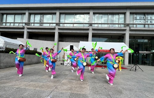 Praktizierende in Hiroshima führen am 15. November 2025 auf dem „Stadtplanungs-Bürgeraustauschfestival“ auf der Bühne den Hüfttrommeltanz auf …