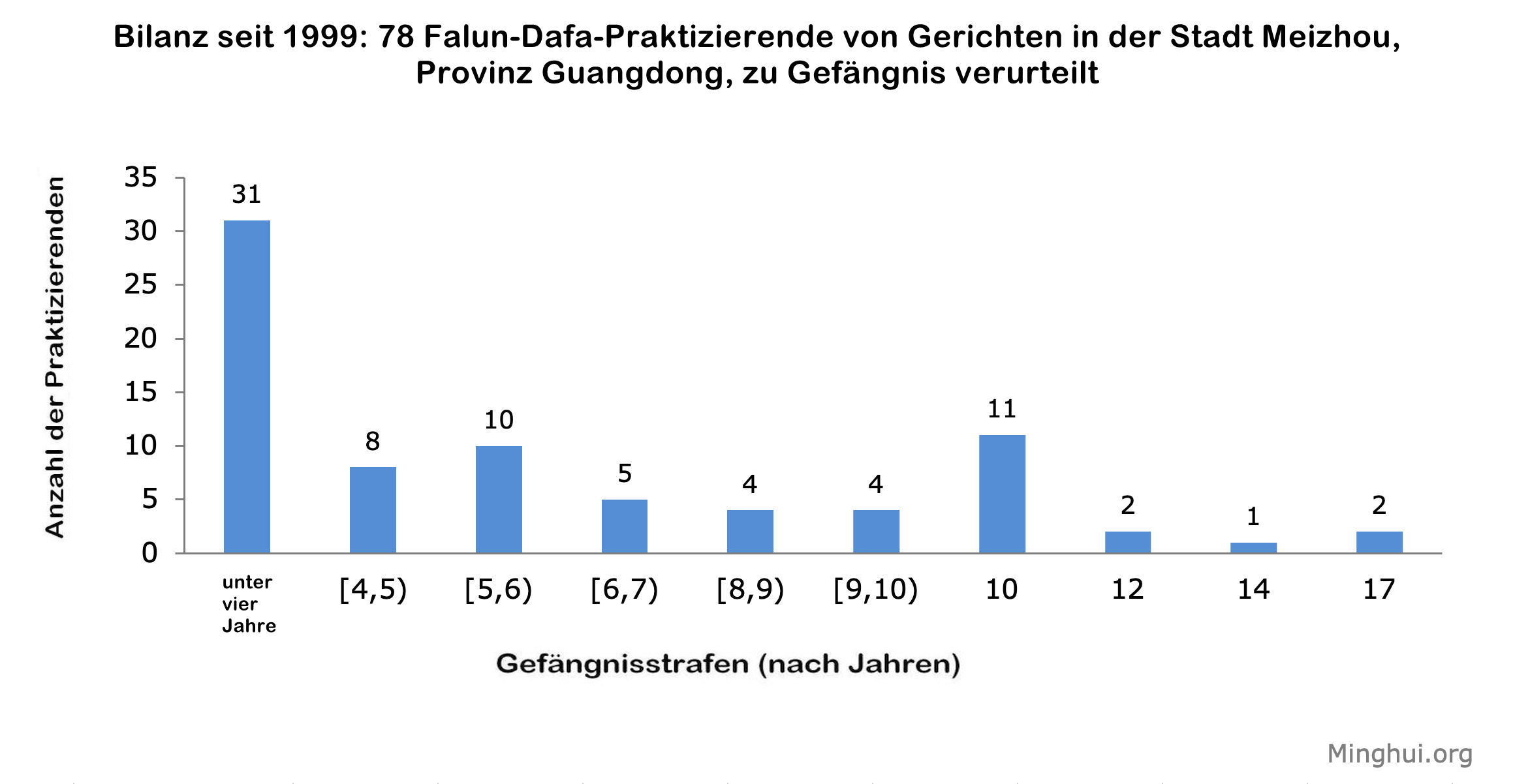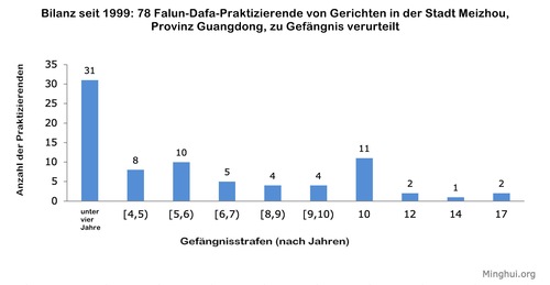 (Minghui.org) Seit Beginn der Verfolgung im Juli 1999 wurden in der Stadt Meizhou, Provinz Guangdong, mindestens 78 Praktizierende wegen ihres Glaubens an Falun Dafa zu Gefängnisstrafen verurteilt.