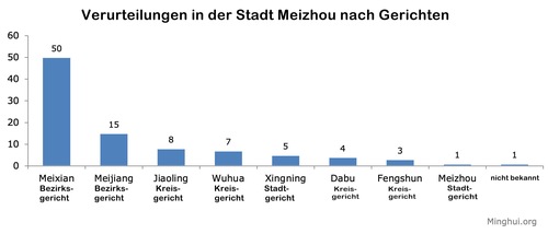 Die Haftstrafen (insgesamt 94 Fälle, da 16 Praktizierende zweimal verurteilt wurden) wurden von acht lokalen Gerichten verhängt: dem Bezirksgericht Meixian, dem Bezirksgericht Meijiang, dem Kreisgericht Jiaoling, dem Kreisgericht Wuhua, dem Stadtgericht Xingning, dem Kreisgericht Dabu, dem Kreisgericht Fengshun und dem Stadtgericht Meizhou.