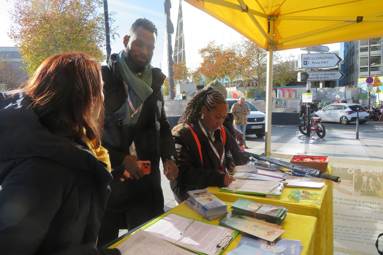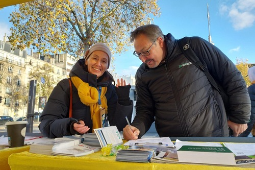 (Minghui.org) Die jährliche Messe der Bürgermeister und Kommunalverwaltungen fand vom 18. bis 20. November 2025 in der Pariser Expo Porte de Versailles statt. Falun-Dafa-Praktizierende nutzten die Gelegenheit, um auf die Verfolgung von Falun Dafa durch die Kommunistische Partei Chinas (KPCh) aufmerksam zu machen. Am 18. und 19. November führten sie vor der Messehalle die Falun-Dafa-Übungen vor und sammelten Unterschriften für eine Petition, die ein sofortiges Ende der Verfolgung durch die KPCh fordert.