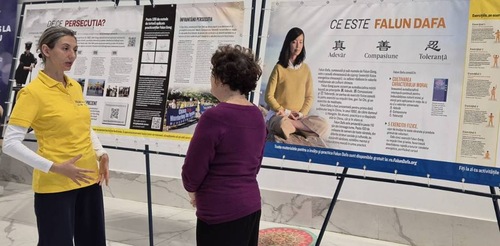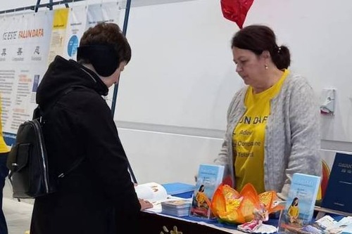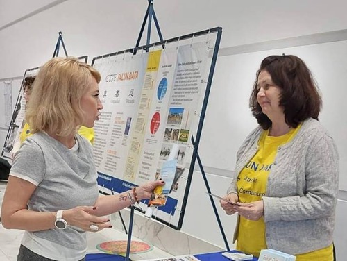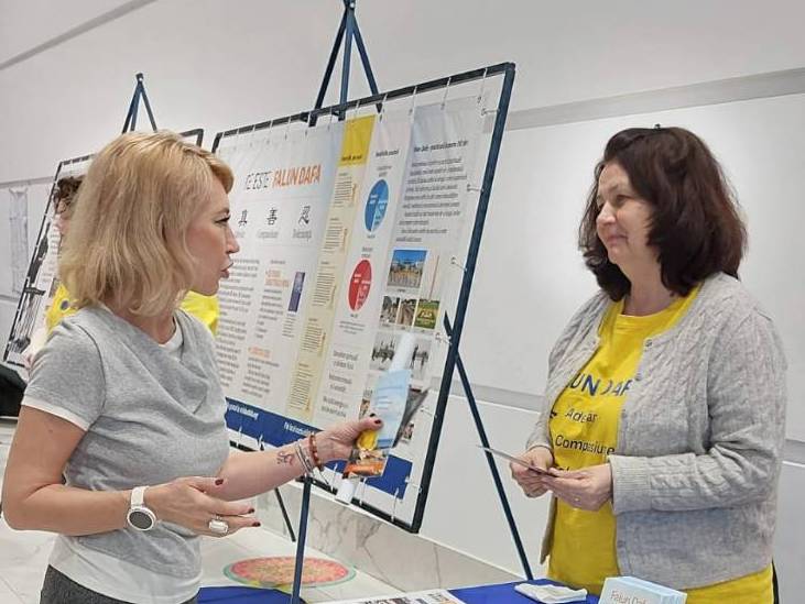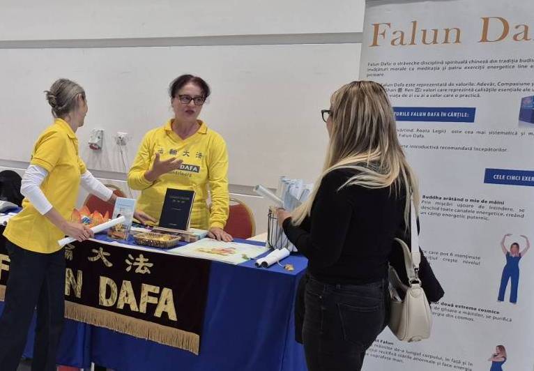 Die Massagetherapeutin Doina Dogaru hörte den Erläuterungen einer Praktizierenden über Falun Dafa aufmerksam zu. Als sie ein Falun-Dafa-Buch aufschlug und das Falun-Emblem erblickte, hielt sie einen Moment inne, betrachtete es lange, legte ihre Hand darauf – und begann zu weinen. Tief bewegt sagte sie, dass dies eine Erkenntnis sei, auf die sie lange gewartet habe.