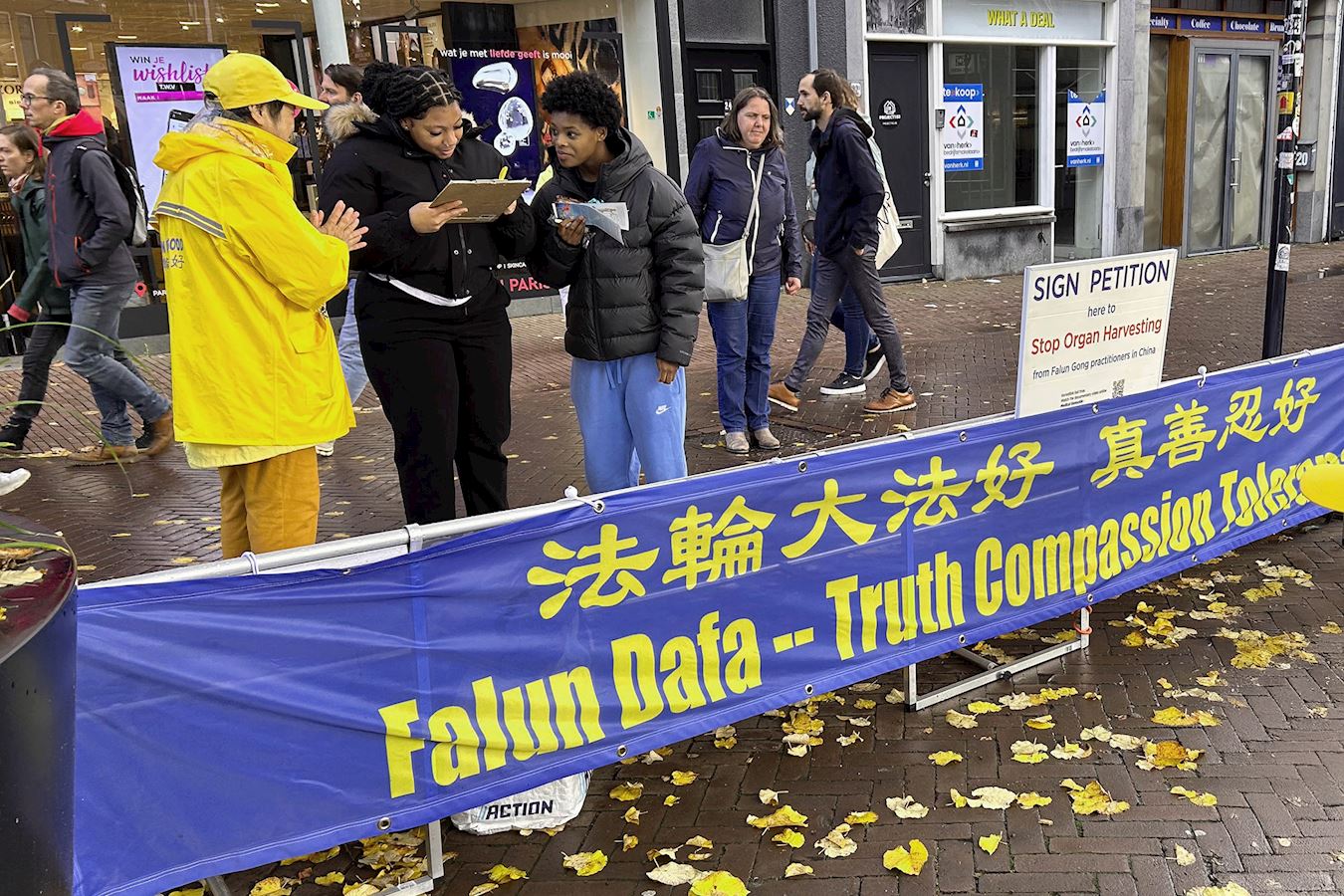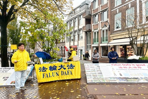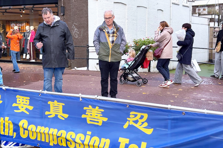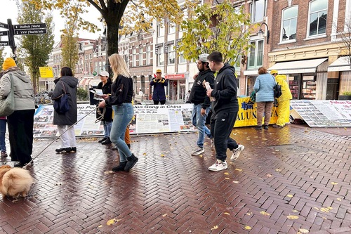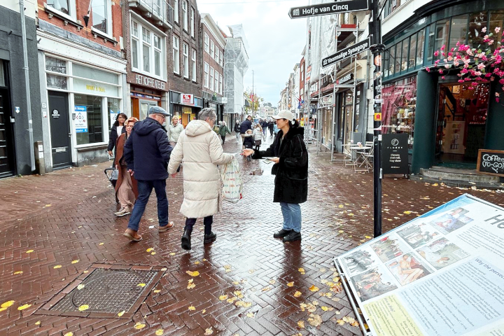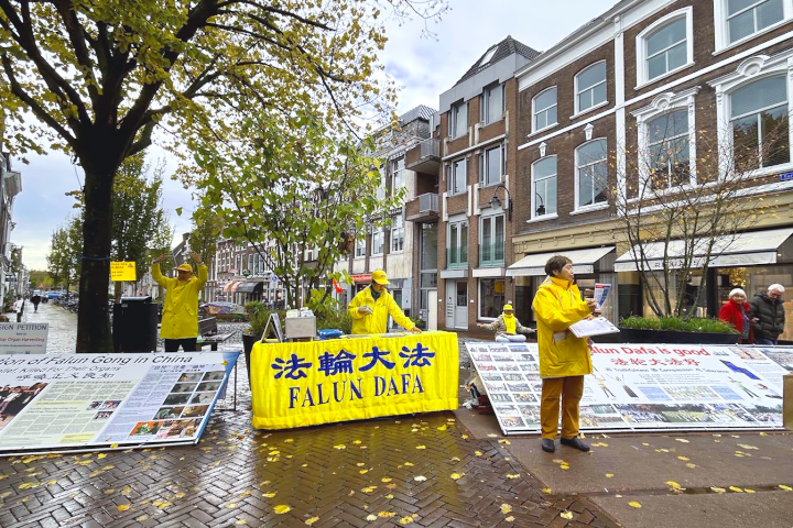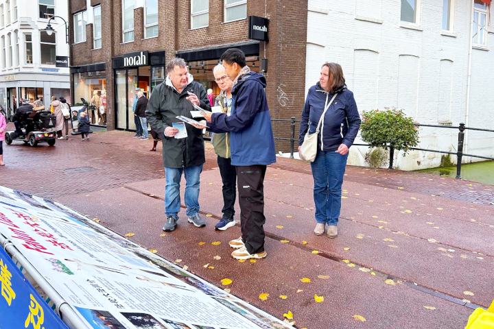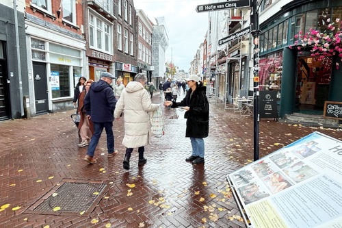 (Minghui.org) Am 1. November 2025 fand in Gouda in den Niederlanden ein Falun-Dafa-Informationstag statt. Auf dem Turfmarkt im Stadtzentrum stellten Praktizierende Infotafeln auf, führten die Übungen vor und verteilten Flyer, um über Falun Dafa und die Verfolgung durch die Kommunistische Partei Chinas zu informieren. Viele Touristen lernten die Praxis dabei erstmals kennen und unterschrieben die Petition für ein Ende der Verfolgung.