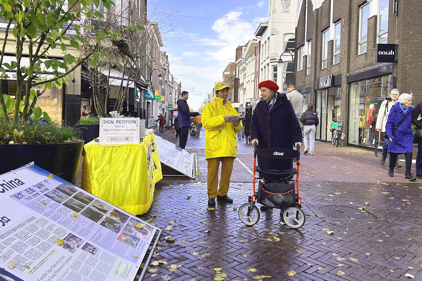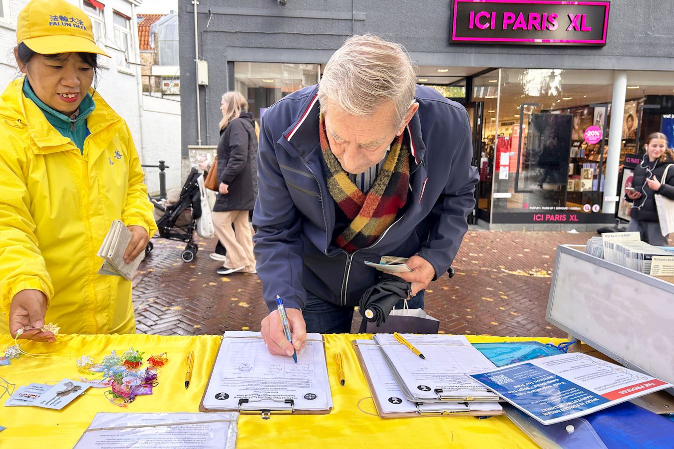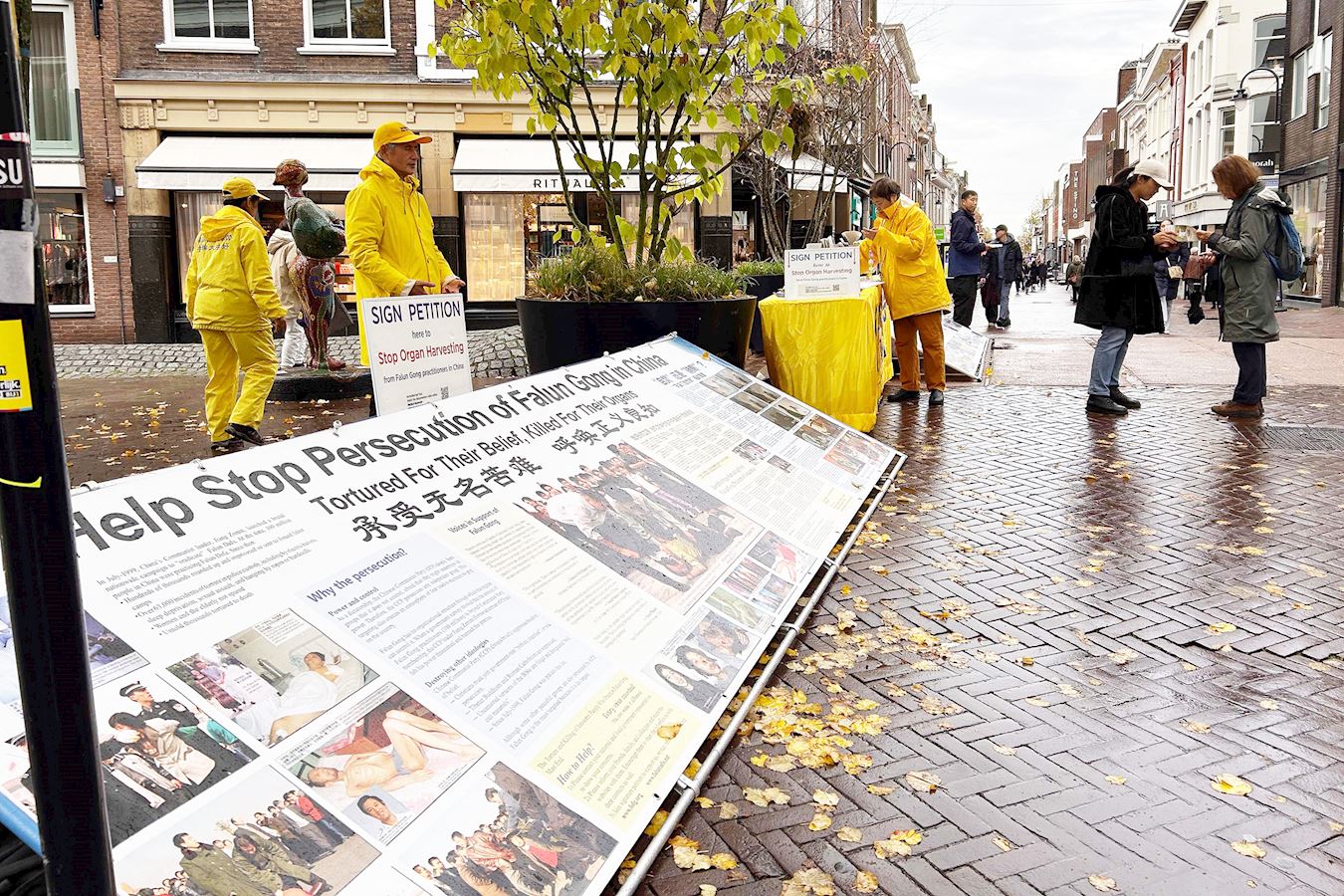 (Minghui.org) Am 1. November 2025 fand in Gouda in den Niederlanden ein Falun-Dafa-Informationstag statt. Auf dem Turfmarkt im Stadtzentrum stellten Praktizierende Infotafeln auf, führten die Übungen vor und verteilten Flyer, um über Falun Dafa und die Verfolgung durch die Kommunistische Partei Chinas zu informieren. Viele Touristen lernten die Praxis dabei erstmals kennen und unterschrieben die Petition für ein Ende der Verfolgung.
