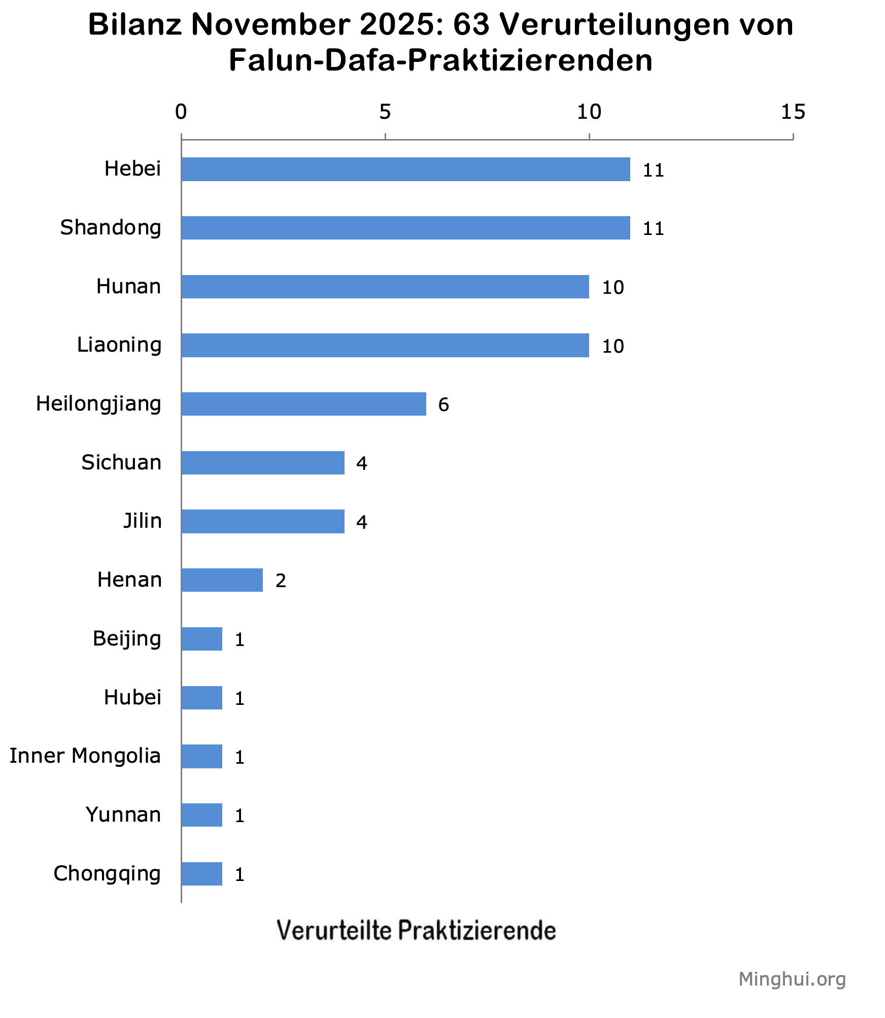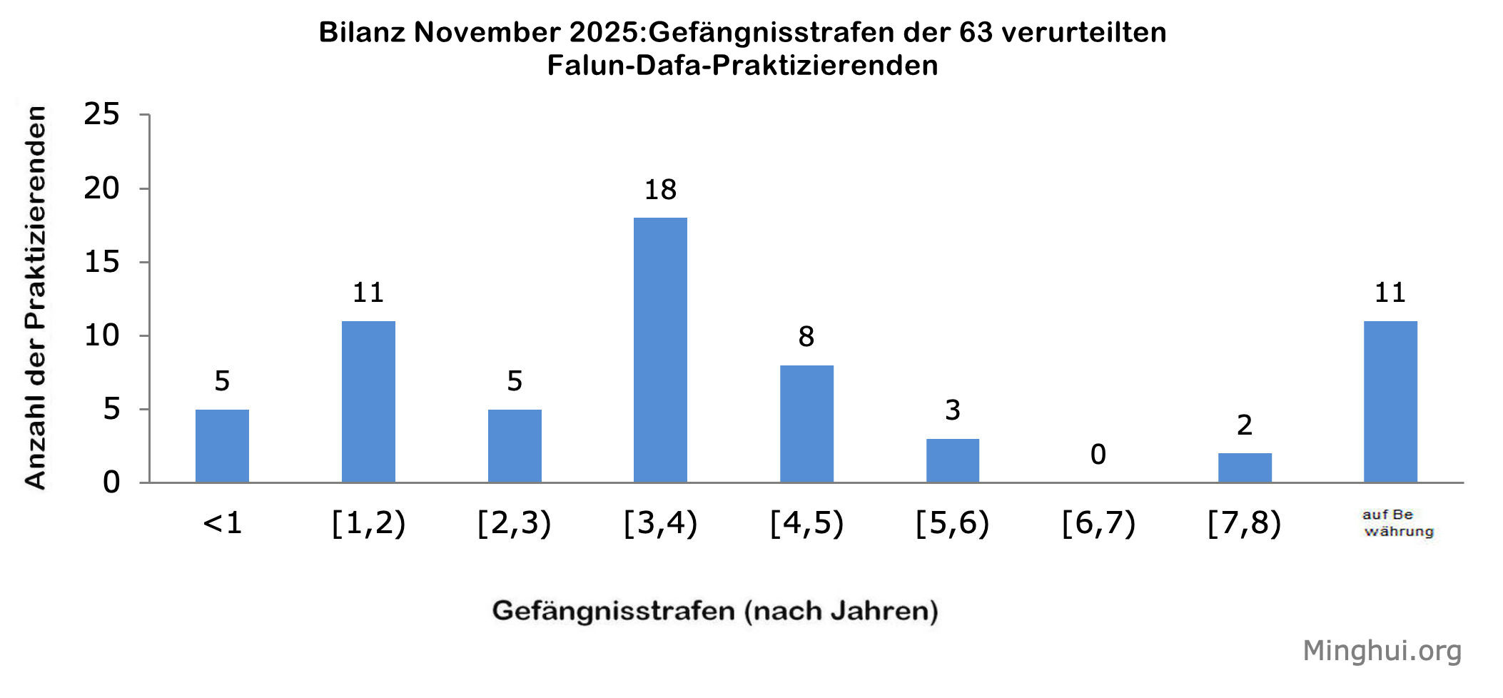 (Minghui.org) Im November 2025 wurden insgesamt 63 Fälle gemeldet, in denen Falun-Dafa-Praktizierende wegen ihres Glaubens zu Gefängnisstrafen verurteilt wurden. 57 dieser Fälle ereigneten sich im Jahr 2025, sechs in den Vorjahren. Die Verzögerung bei der Meldung ist auf die Informationszensur in China unter dem kommunistischen Regime zurückzuführen, die es den Minghui-Korrespondenten erschwerte, die Daten zeitnah zu sammeln, zu überprüfen und zu veröffentlichen.