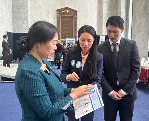 Wang Xuan, ein ehemaliger Solotänzer von Shen Yun Performing Arts, und seine Schwester Lydia Wang, trafen sich mit der Abgeordneten Young Kim und anderen Besuchern und berichteten über das Leid ihrer Eltern aufgrund der Verfolgung durch die KPCh. Ihr Vater wurde viermal wegen seines Glaubens an Wahrhaftigkeit, Güte und Nachsicht inhaftiert, bis er im September 2009 verstarb. Ihre Mutter Liu Aihua ist wegen ihres Glaubens in China inhaftiert.