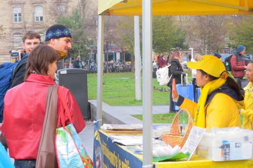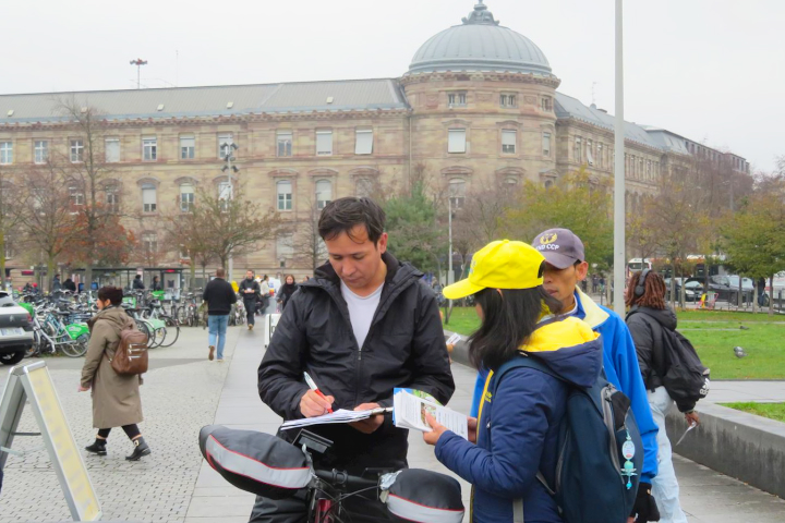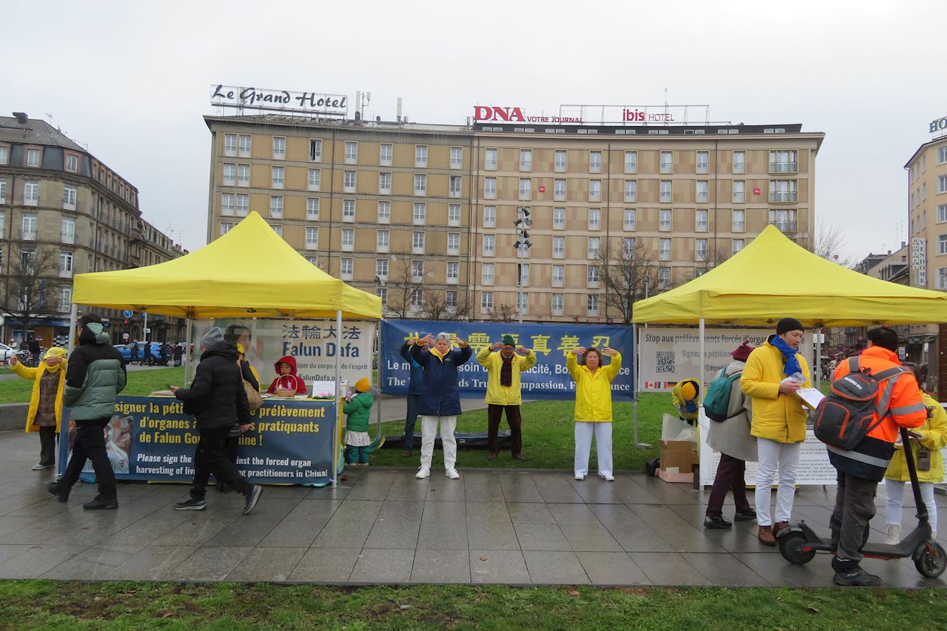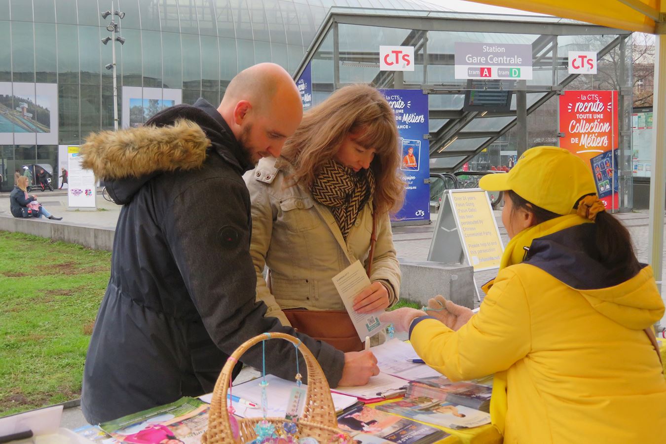 Vom 5. bis 7. Dezember stellen Praktizierende ihren Kultivierungsweg Falun Dafa auf dem Platz vor dem Straßburger Bahnhof vor. Viele Menschen unterschreiben die Petition, die ein Ende der Verfolgung in China fordert.