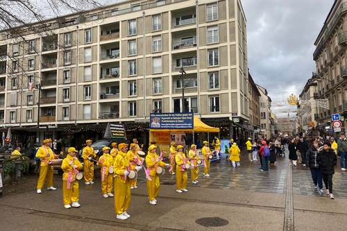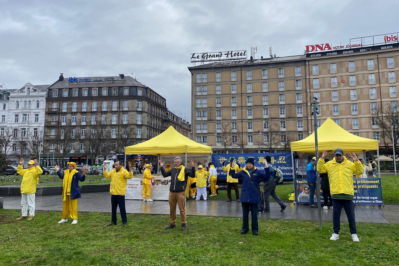 An diesem Samstag vor den Winterferien regnete es leicht, trotzdem versammelte sich eine große Menschenmenge auf dem Place de la République. Falun-Dafa-Praktizierende führten die Übungen vor und informierten Passanten. Die Übungsvorführung veranlasste viele, stehen zu bleiben und Fotos zu machen. Einige fotografierten auch die Informationstafeln. Mehrere Personen zeigten sich betroffen von den Berichten über die Verfolgung und unterschrieben die Petition gegen den Organraub. Viele bedankten sich bei den Praktizierenden für deren Anwesenheit.