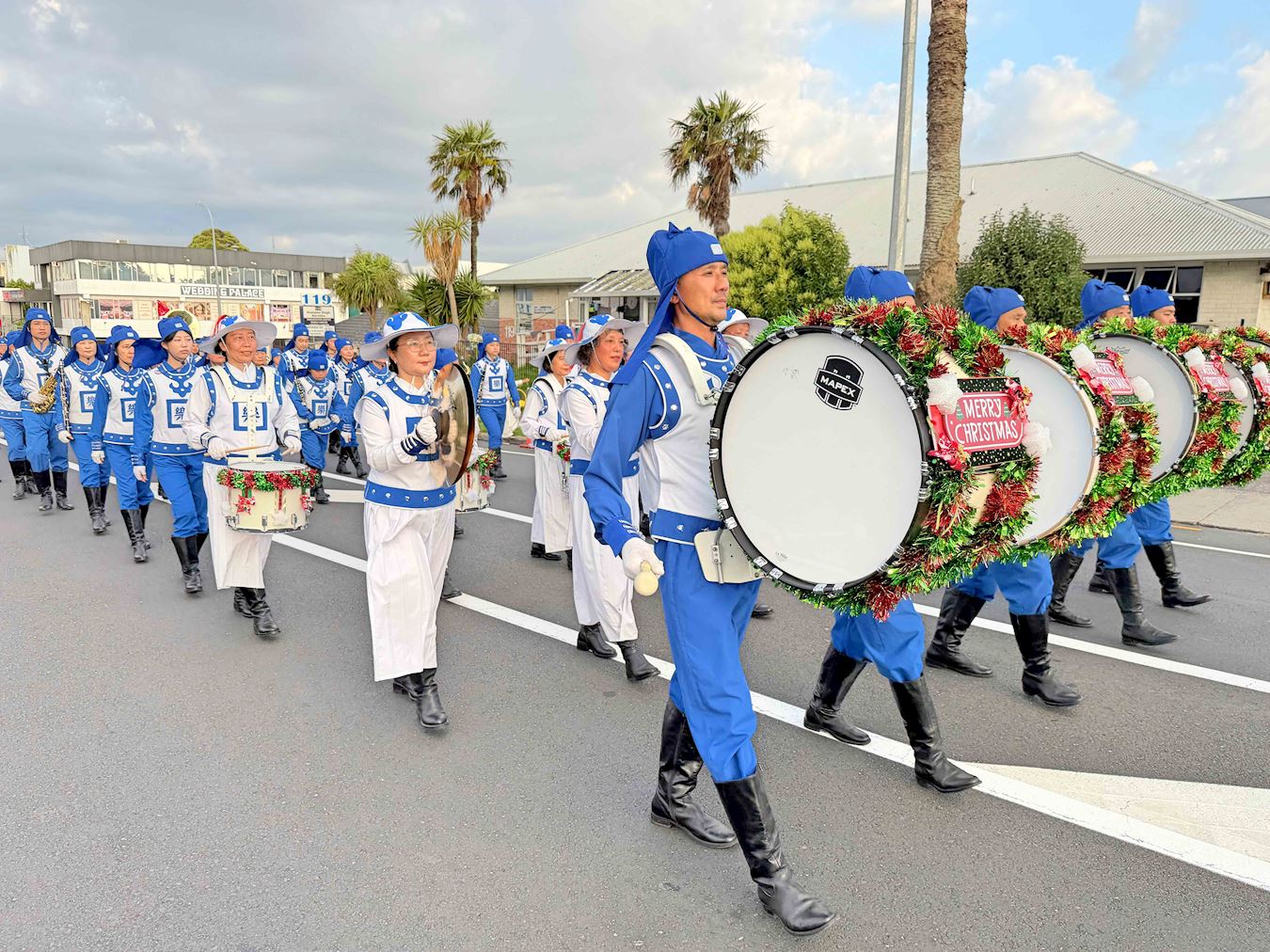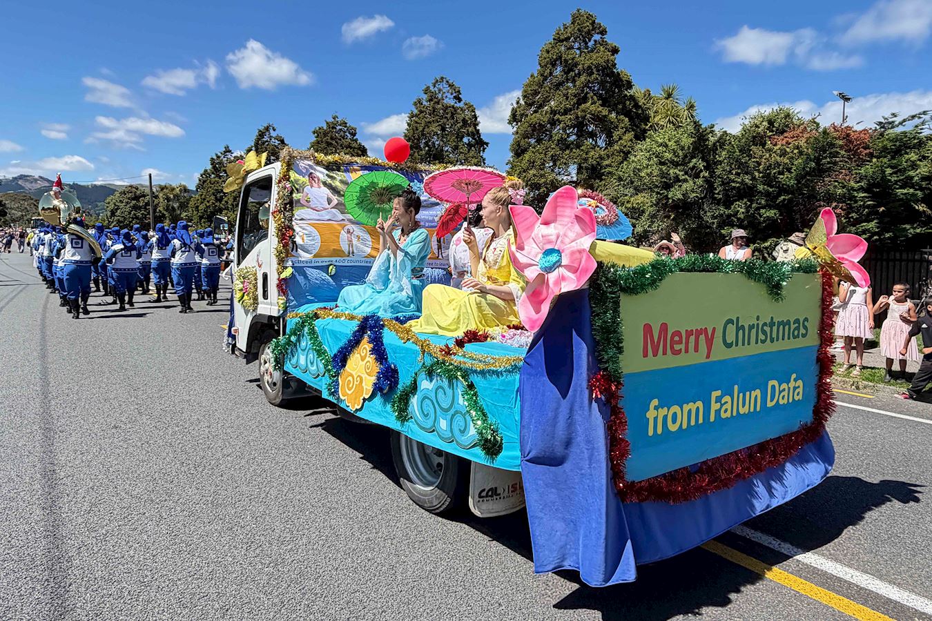 Die Tian Guo March Band und der Umzugswagen der Praktizierenden bei der Kapiti Coast Christmas Parade am 13. Dezember