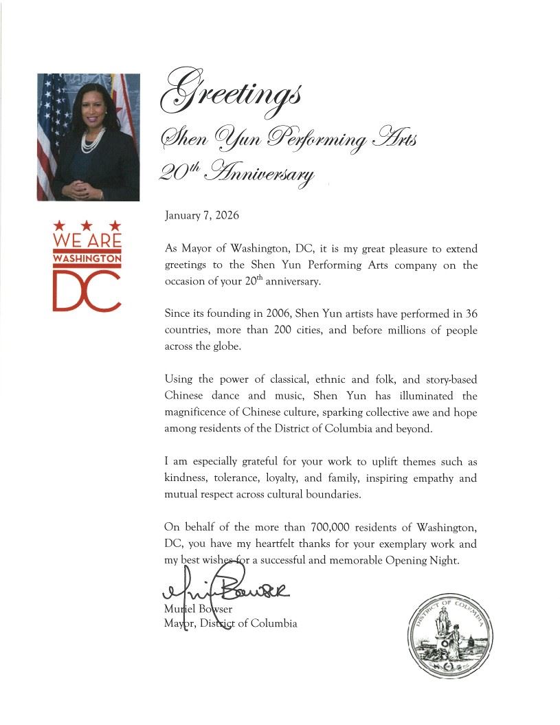 (Minghui.org) Muriel Bowser, Bürgermeisterin von Washington, D.C., gratulierte Shen Yun Performing Arts in einem Brief zum 20-jährigen Bestehen. Sie dankte den Künstlern für ihre herausragende Arbeit und dafür, dass sie die Pracht der chinesischen Kultur eindrucksvoll präsentieren.
