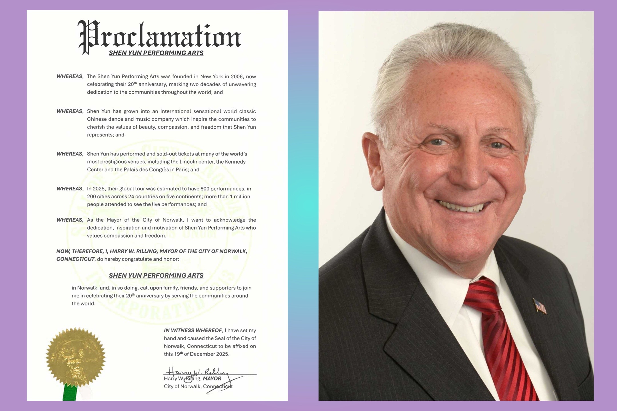 Im Dezember 2025 erlässt Bürgermeister Harry W. Rilling von Norwalk, Connecticut, eine offizielle Erklärung für Shen Yun Performing Arts