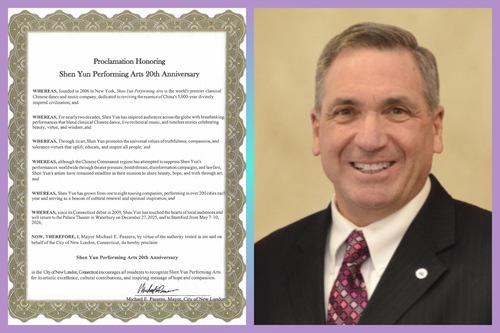 Im Dezember 2025 stellt Bürgermeister Michael E. Passero von New London, Connecticut, eine Proklamation aus zum 20-jährigen Jubiläum von Shen Yun Performing Arts