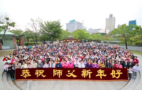 Praktizierende aus Taoyuan, Hsinchu und dem Landkreis Miaoli haben sich im Zhubei-Kulturpark versammelt, um Meister Li ein frohes neues Jahr zu wünschen