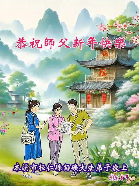 „Winter und Sommer gewechselt, Jahr für JahrZeit verfliegt, Jahre vergangenRückblick auf unseren KultivierungswegIm Wind und Regen, durch Dick und Dünn, im HandumdrehenBarmherzige Lehre durchdringt VerwirrungFa-Prinzipien erfüllen unsere HerzenGnade der Neuerschaffung nur schwer zurückzugebenVerbeugung zum NeujahrFleißig vorankommen, nicht verweilen“