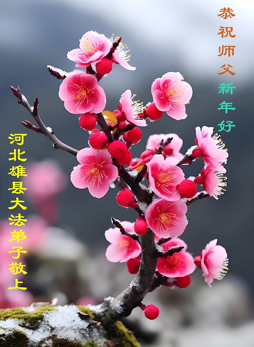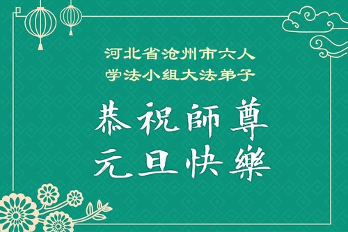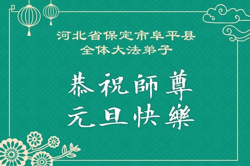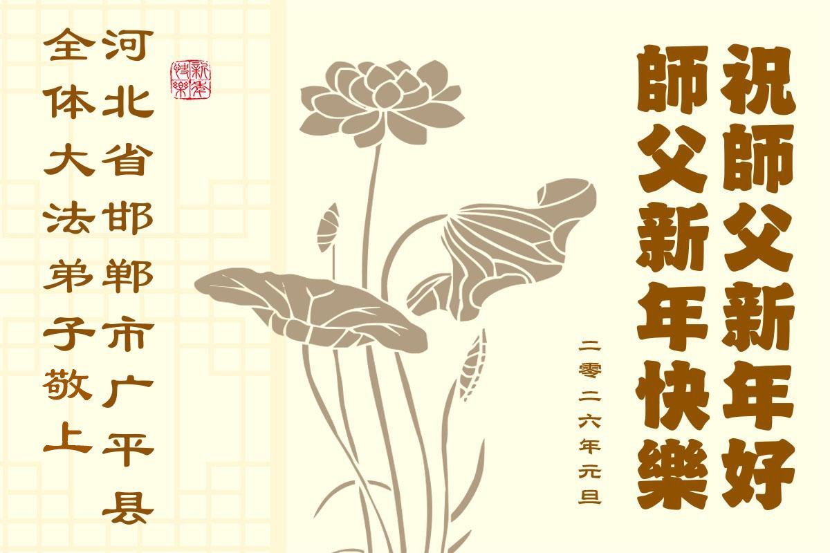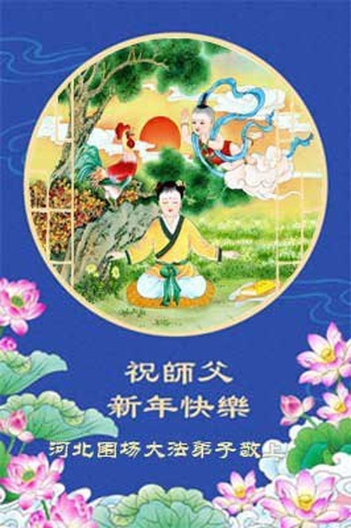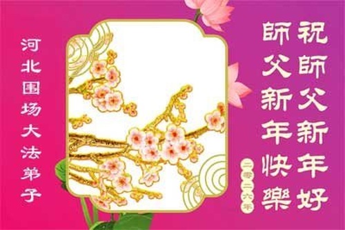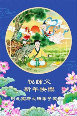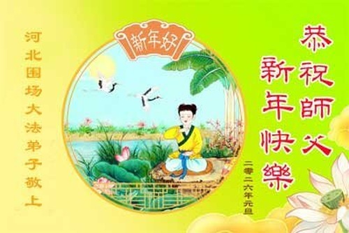(Minghui.org) Zu Neujahr senden Falun-Dafa-Praktizierende auf der ganzen Welt traditionell Neujahrsgrüße, Grußkarten, Gedichte und Fotos an die Minghui-Website. Damit wünschen sie ihrem verehrten Meister Li Hongzhi ein frohes neues Jahr und bringen dem Meister ihre Dankbarkeit für die barmherzige Errettung zum Ausdruck. Sie geloben, in ihrer Kultivierung fleißig voranzukommen und noch mehr Lebewesen zu erretten. Im Folgenden veröffentlichen wir einen Teil dieser Grüße aus Hebei: