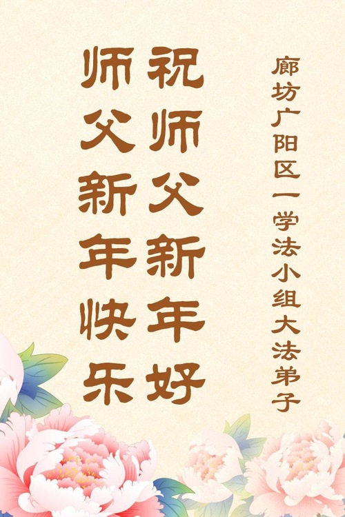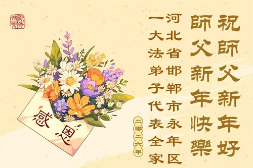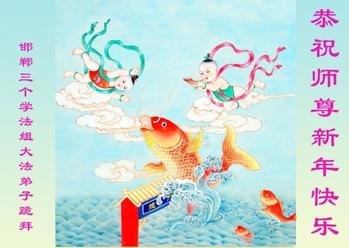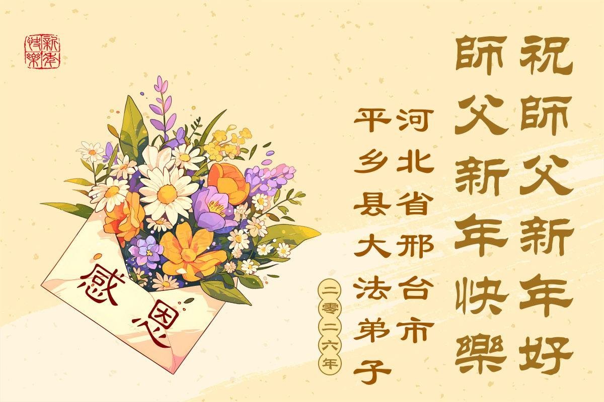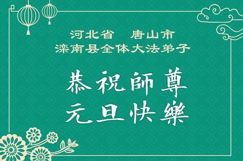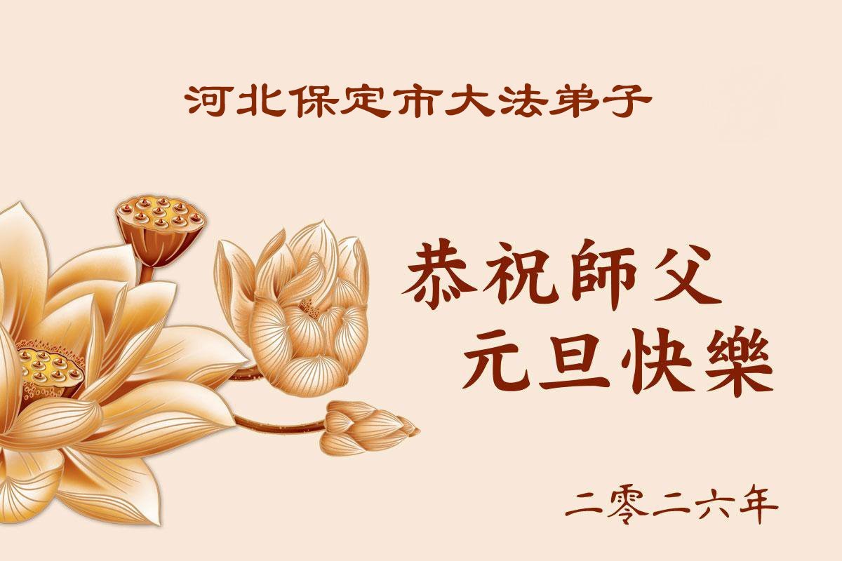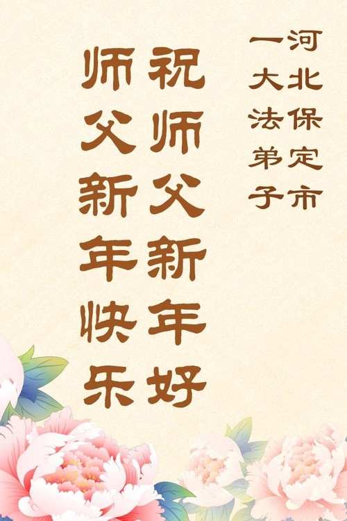 (Minghui.org) Zu Neujahr senden Falun-Dafa-Praktizierende auf der ganzen Welt traditionell Neujahrsgrüße, Grußkarten, Gedichte und Fotos an die Minghui-Website. Damit wünschen sie ihrem verehrten Meister Li Hongzhi ein frohes neues Jahr und bringen dem Meister ihre Dankbarkeit für die barmherzige Errettung zum Ausdruck. Sie geloben, in ihrer Kultivierung fleißig voranzukommen und noch mehr Lebewesen zu erretten. Im Folgenden veröffentlichen wir einen Teil dieser Grüße aus Hebei: