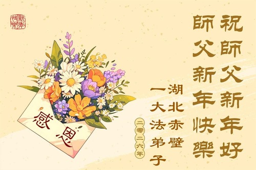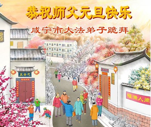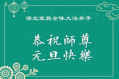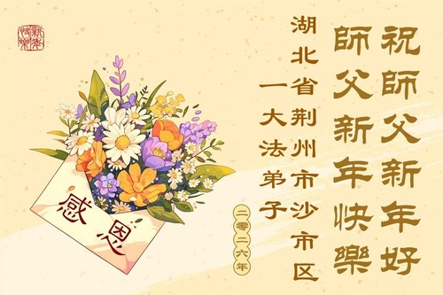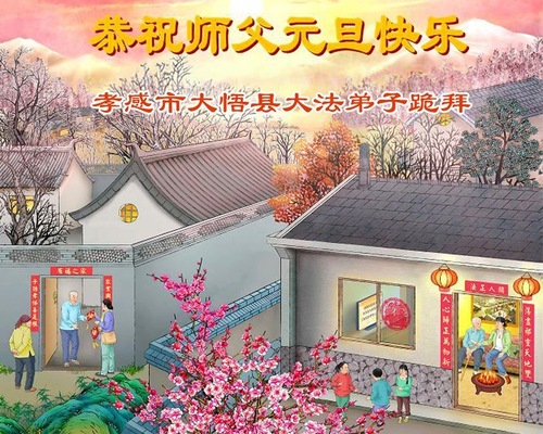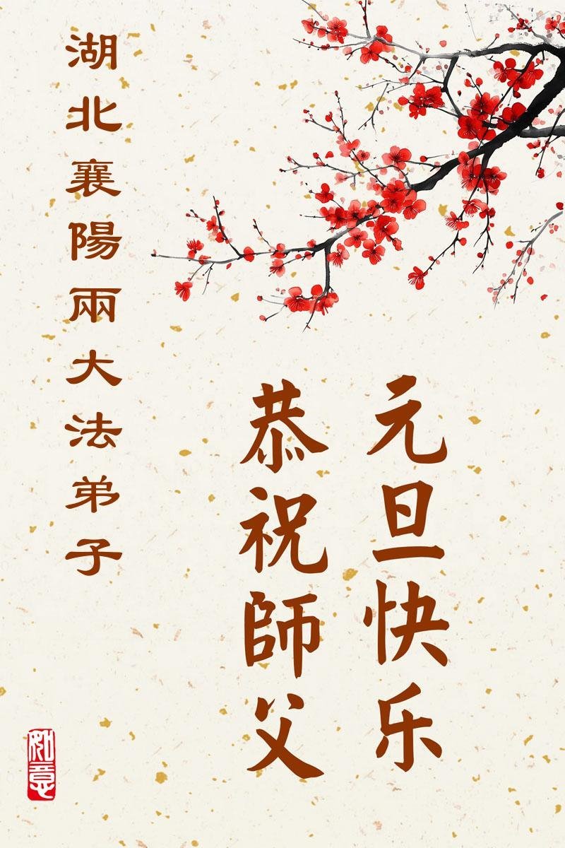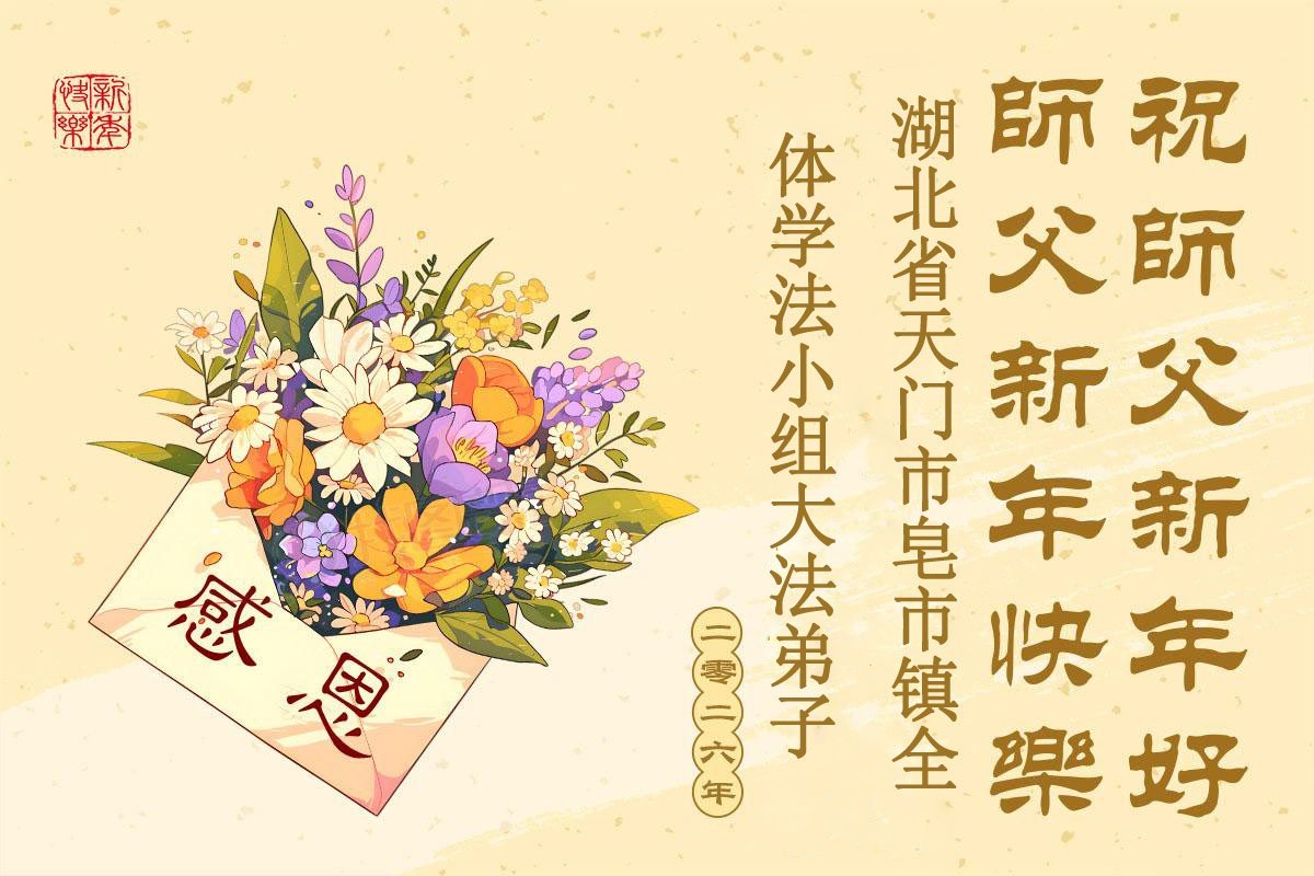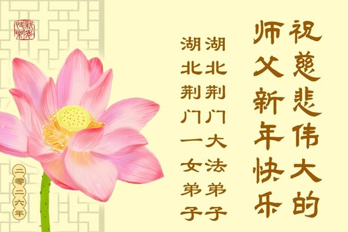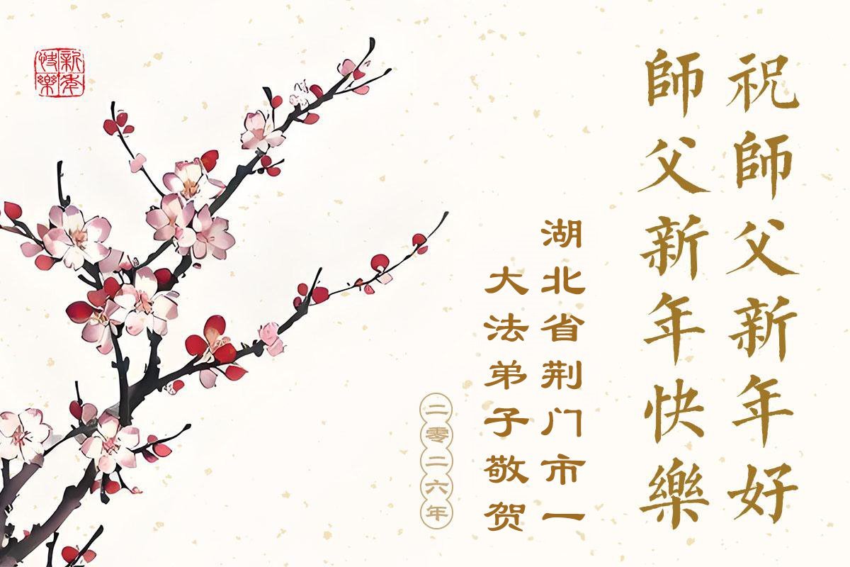 (Minghui.org) Zu Neujahr senden Falun-Dafa-Praktizierende auf der ganzen Welt traditionell Neujahrsgrüße, Grußkarten, Gedichte und Fotos an die Minghui-Website. Damit wünschen sie ihrem verehrten Meister Li Hongzhi ein frohes neues Jahr und bringen dem Meister ihre Dankbarkeit für die barmherzige Errettung zum Ausdruck. Sie geloben, in ihrer Kultivierung fleißig voranzukommen und noch mehr Lebewesen zu erretten. Im Folgenden veröffentlichen wir einen Teil dieser Grüße aus Hubei: